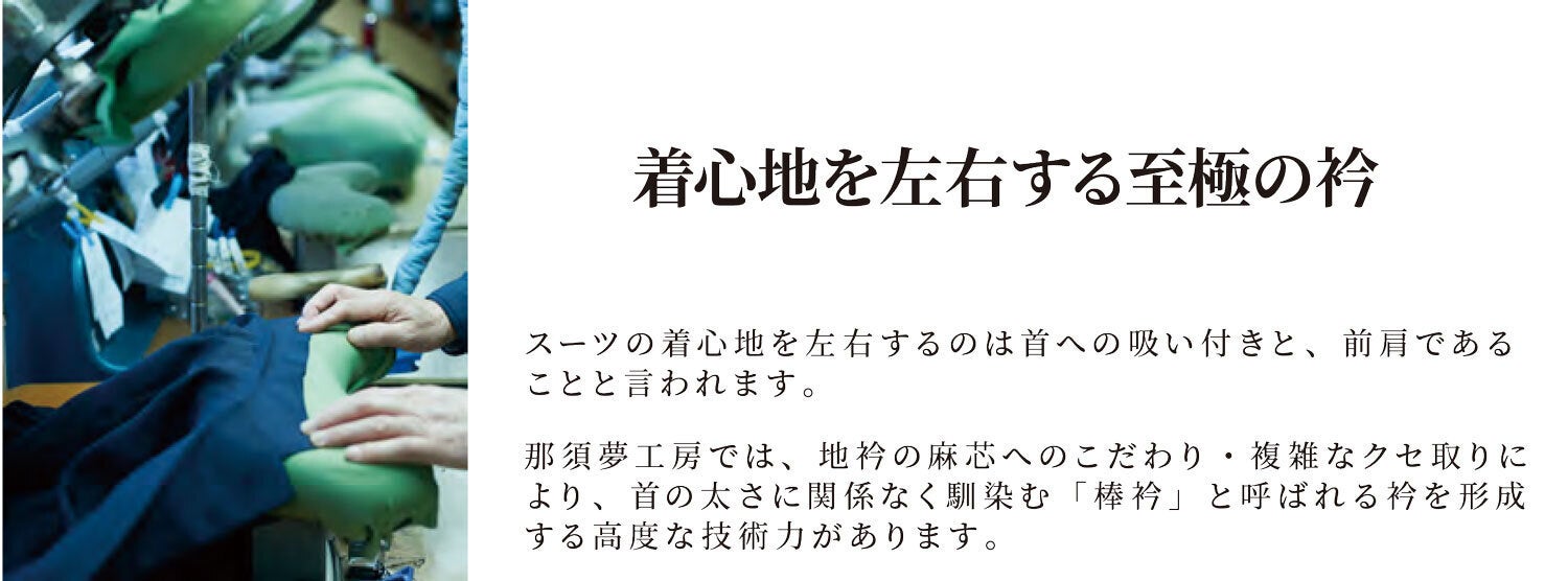 那須夢工房が得意とする、棒衿仕立て、前肩空間、中間プレスによる立体的な作り、そのすべてを凝縮しているので、スーツを着た時に重みを感じさせません。