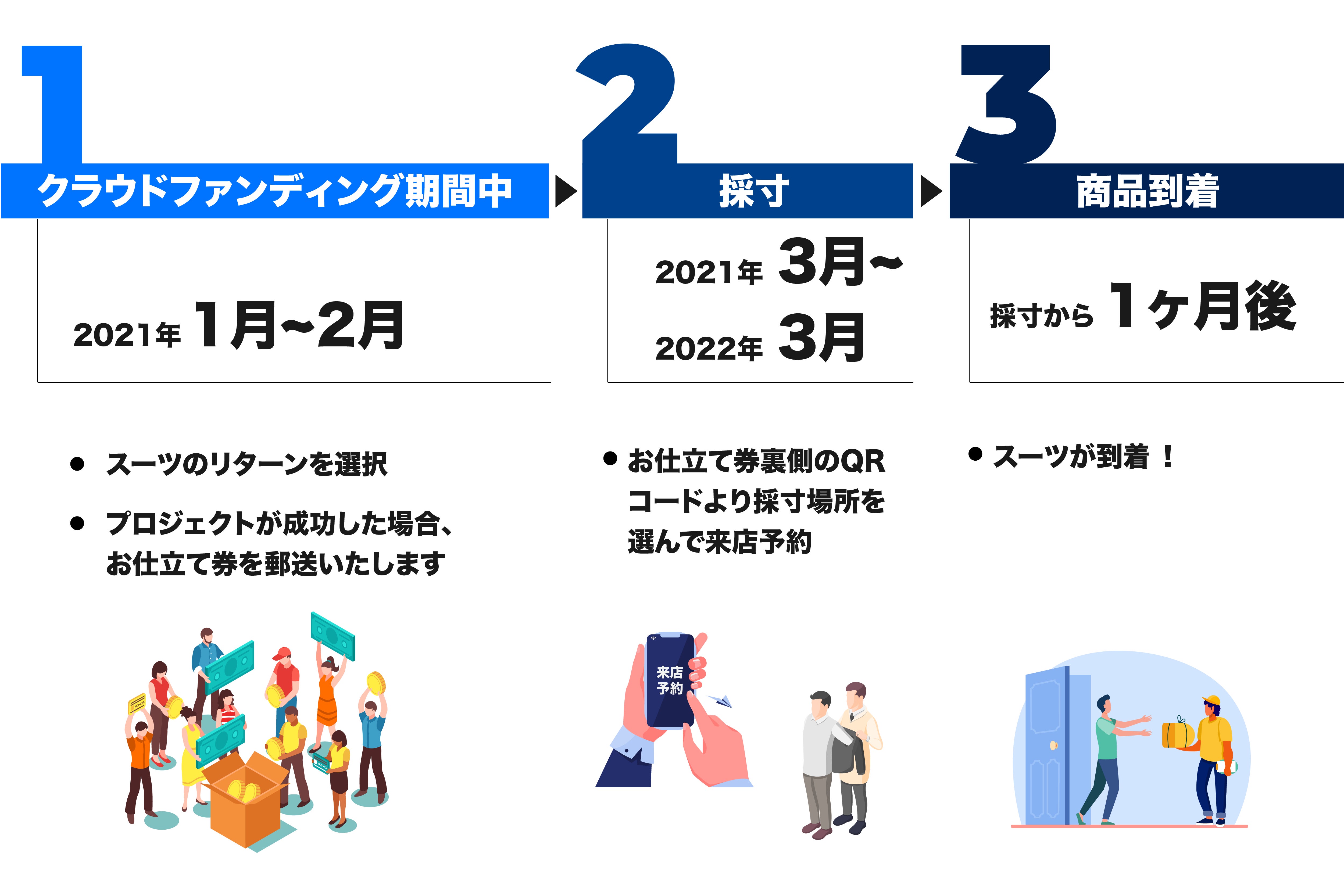 スーツのリターンをお選びいただいた際に採寸が必要です。