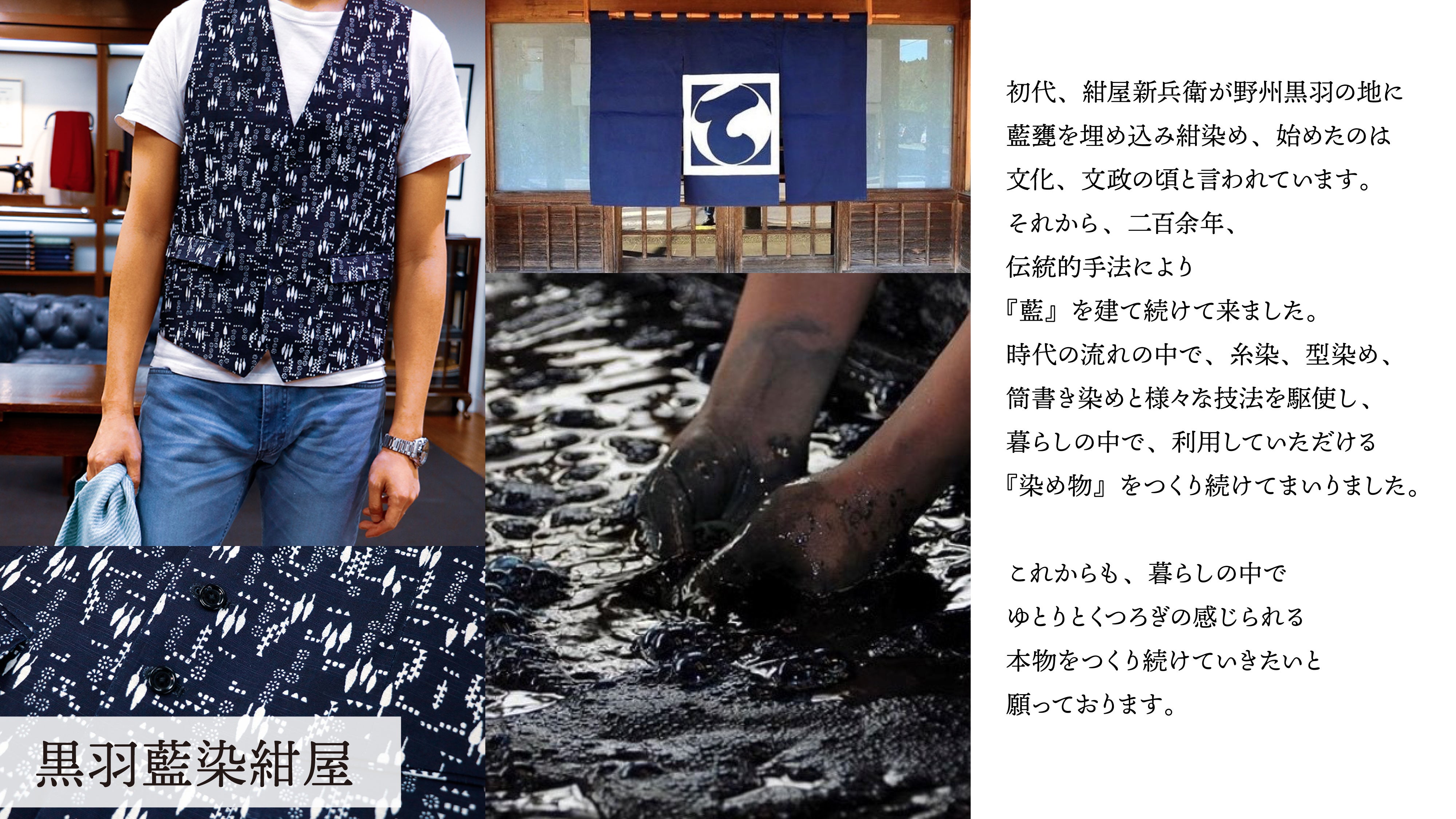 KINDWAREの自社縫製工場である、「那須夢工房」と栃木県指定伝統工芸品の黒羽藍染をつくる「黒羽藍染紺屋」のコラボベストです。