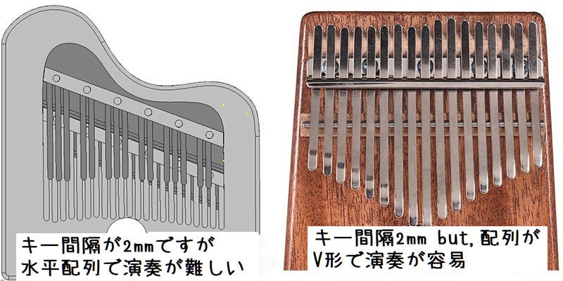 市場で販売されている17音カリンバキーの間隔を基準に作ってみるとキー間隔が狭くなって演奏が難しくなりました。