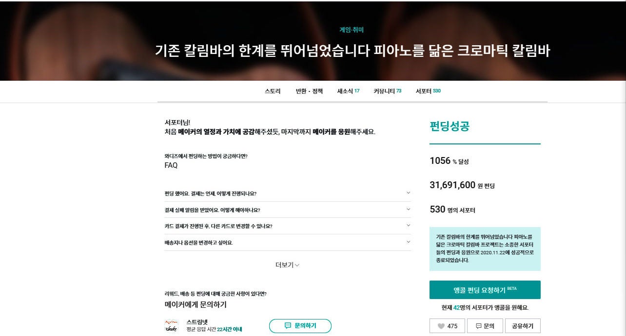 530人のサポーターと1056%達成率3千100万Won獲得