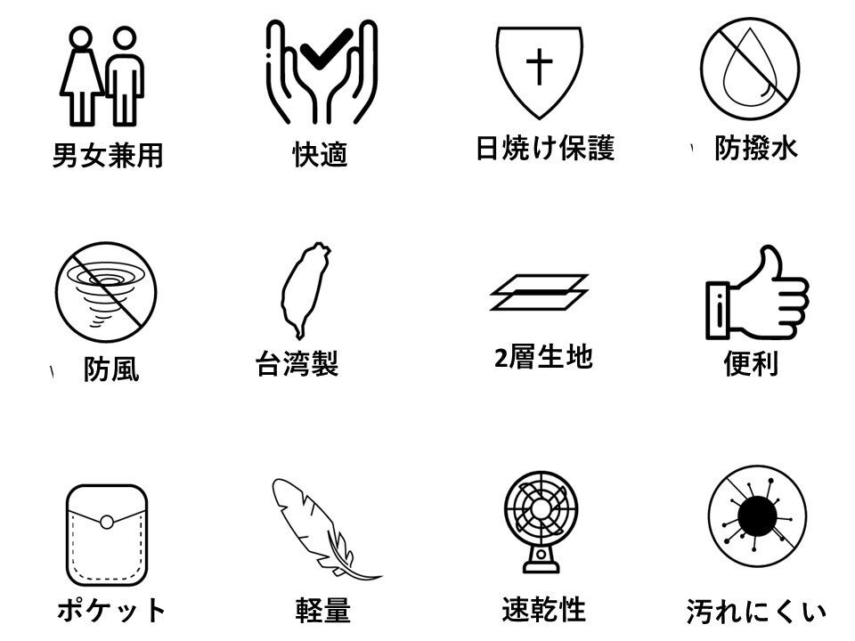 特徴 撥水、紫外線防止、4方向伸縮性、しわ防止、防風