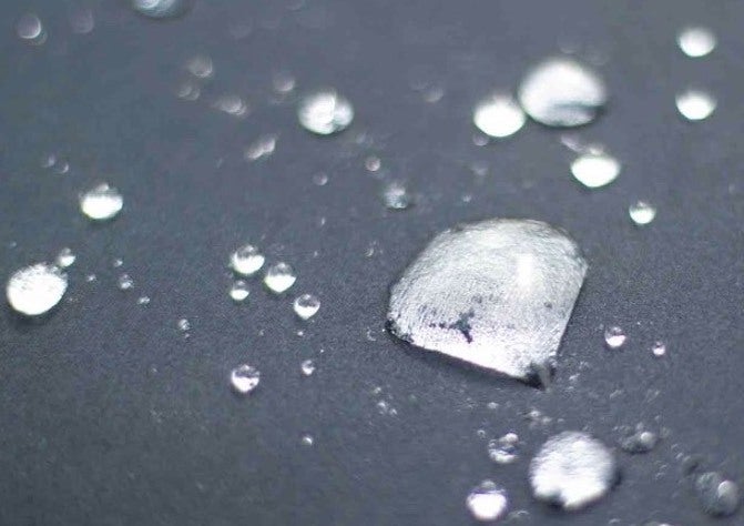 撥水は水を弾くために写真のように水がコロコロと転がって落ちていくので生地が濡れないようになっています。