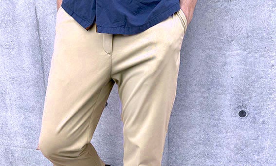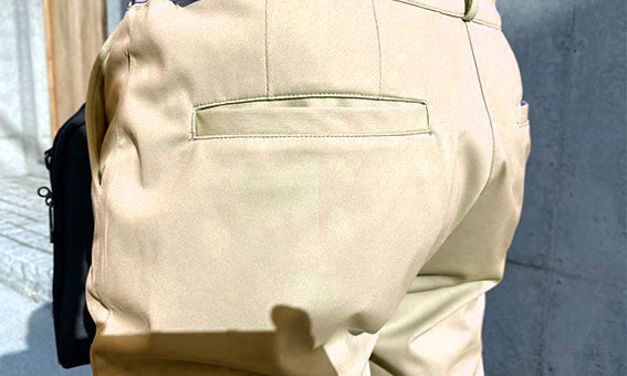 普通のパンツはしゃがんだ時に腿のあたりがきつくなったりしますが4 WAY STRETCH生地は窮屈さを感じません。