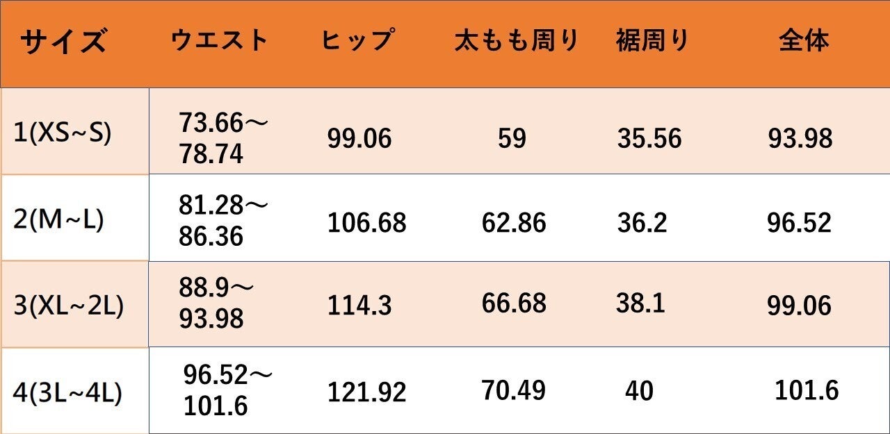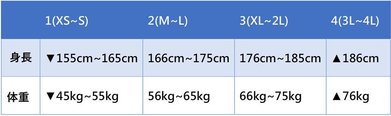 SKU仕様 1(XS-S)、2(ML)、3(XL-2XL)、4(3XL-4XL)