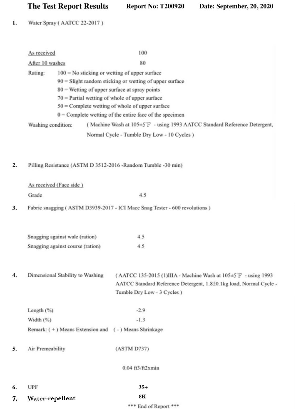8K撥水パンツは抗UV試験を行った結果、「紫外線防御指数はUPF35+」でした。