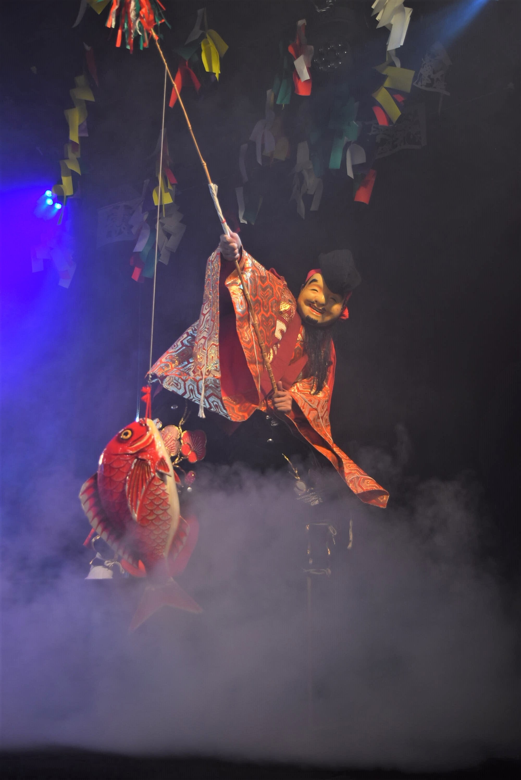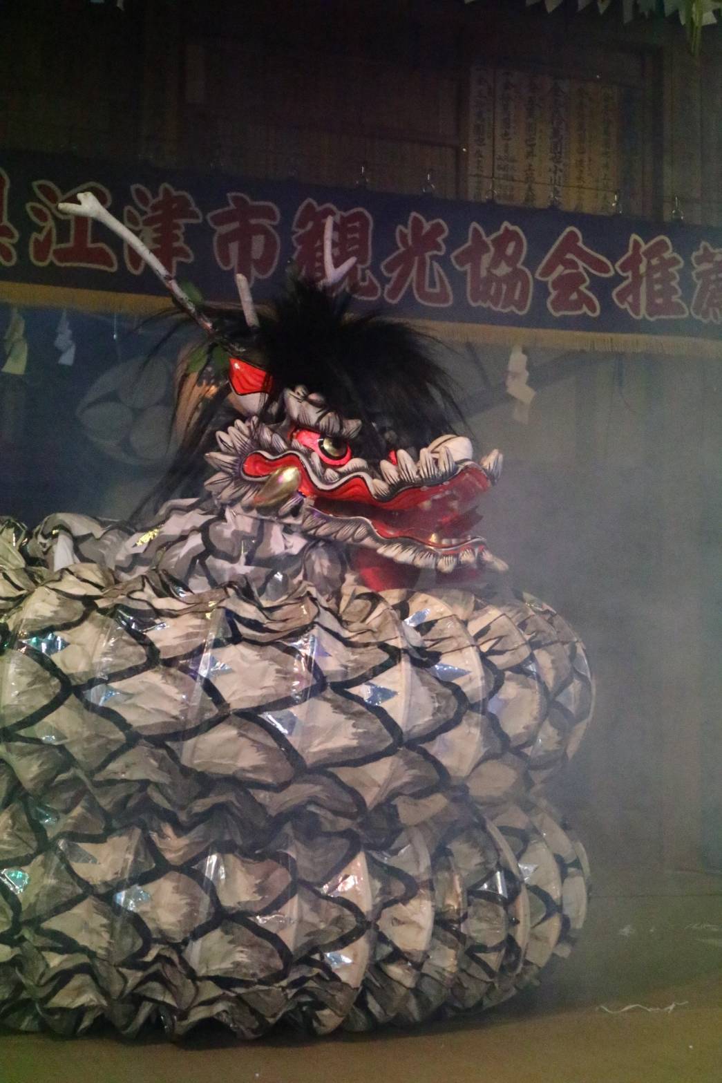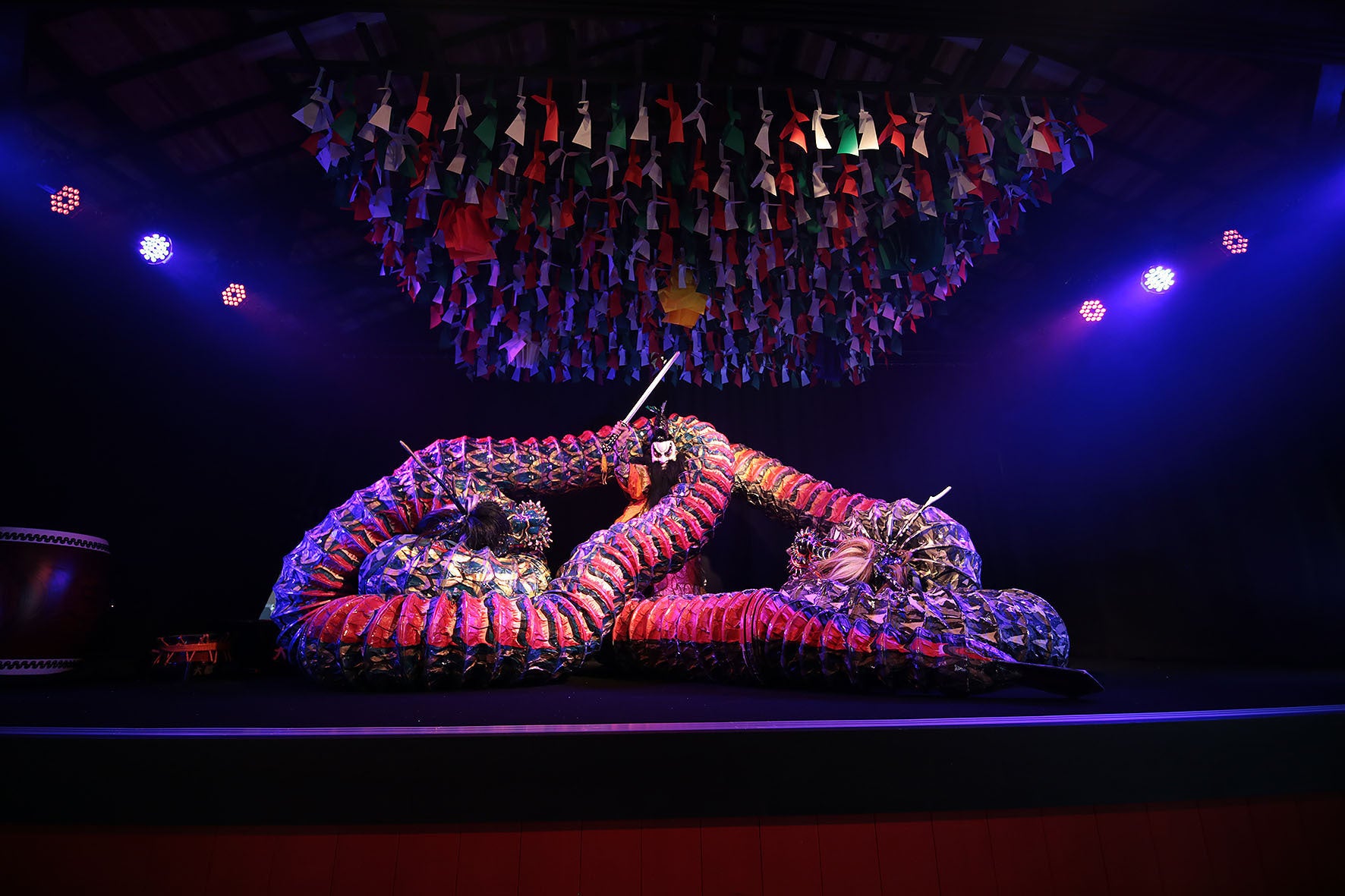 石見神楽は明治以降、神職から民衆に伝わり、今では130以上の神楽団があり、各地の神社例祭で行われる奉納神楽やお祭り、イベントなどで披露されています。2019年5月には日本遺産に登録されました。石見神楽の演目で一番有名な演目は「大蛇(オロチ)」です。これはスサノオノミコトが大蛇を退治するところを題材にしたもので、17メートルもある大蛇がスサノオノミコトと対決する演目です。対決は火花が散り、大迫力の演出です。他にも、恵比寿様が登場する演目もあります。恵比寿様が鯛を釣る様子を演じているのですが、撒き餌として蒔く餌は実は飴で、子供たちがこの飴に群がる様子がお決まりの演目です。ただ見ているだけでなく、参加型の演目があるのも醍醐味です。