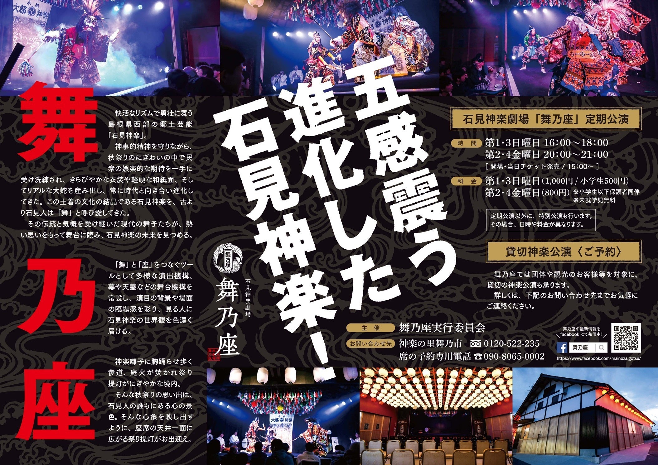 弊社は石見神楽の専用会場「石見神楽劇場 舞乃座」を2019年3月に完成させました。会場は設計から施工まで神楽の舞手の思いを十分に取り入れ、音響や照明なども出来る限り設備し、全体的に芝居小屋をイメージし、舞子もお客様も石見神楽の舞に集中できる環境が出来たと思っています。