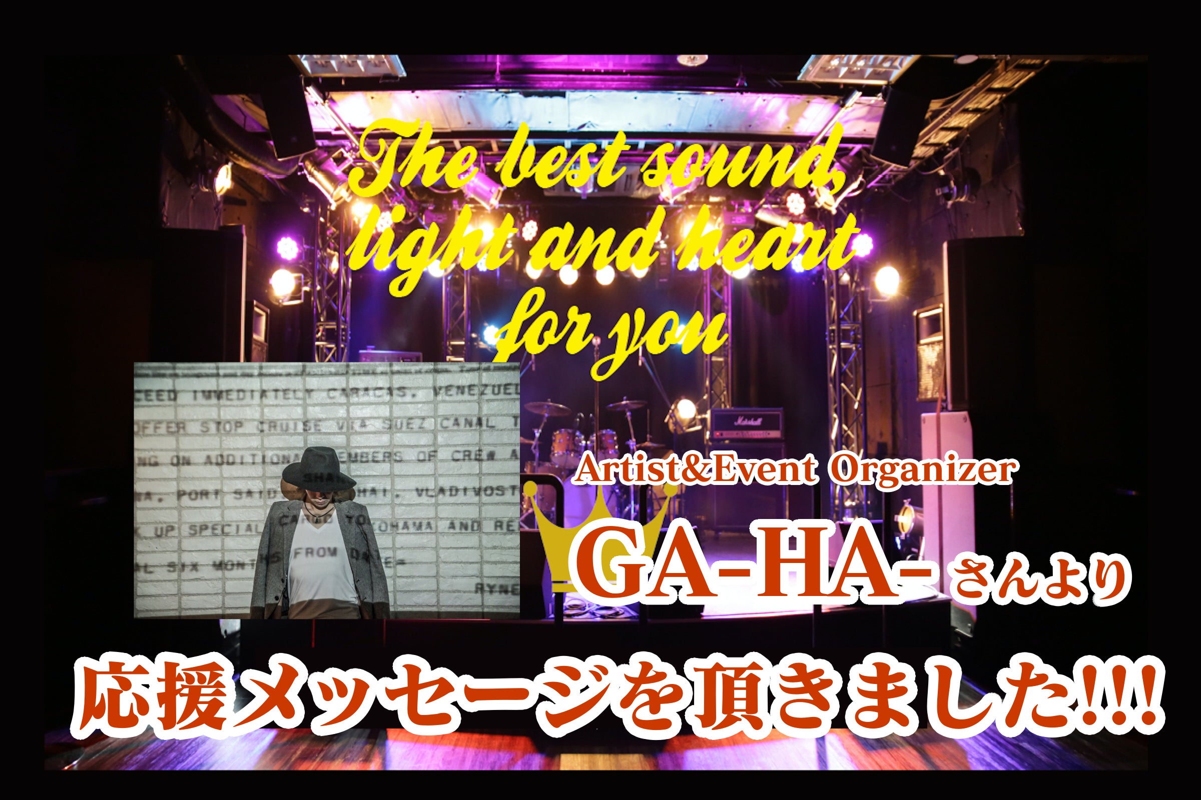 今回のプロジェクトに際して、Artist&Event OrganizerとしてOPEN当初から多くのイベント開催、出演をして頂き、Asakusa Gold Soundsに深く携わってきて頂いた方の一人、GA-HA-さんより応援メッセージを頂きました!以下、GA-HA-さんからのメッセージです。Artist&Event Organizer の GA-HA-さん「憎い憎い。。。」と言っても何も現状は変わりもしない昨今。僕らは話を前に進めなきゃいけないし、とにかく一歩踏み出さなければ、沈んでしまう船に乗っている可能性もあります。そういう意味で、新型コロナウィルスからのメッセージをポジティブに捉える事とすると「今一度 手を繋ごう」だと思っております。僕らの世界は 僕だけで作ったモノでもあなただけで作ったモノでもなくて誰かが作ってくれたモノが積み重なって、生きていけてるという事正解や不正解をだす事が極めて難しくなった時代は僕らが「選んだか」「選ばなかったか」のモノサシに変わりました僕は、手を差し伸べる人生を選びます。喜びを、隣の誰かと分かち合う人生を選びます音楽を通じて限りある時間を共有する僕らの遊び場を、非力ながら支援します。恐縮ながら 僕からも皆様に支援のお願いできたらと思いメッセージを送らせて頂きました。GoldsoundsのBARカウンター で乾杯しましょう!2021年は叶えていきますよ。僕らから未来を迎えにいきましょうでは、またGA-HA--------------------------------------------------------------------------------------------本プロジェクトは、12/16現在、残り14日、達成率52%となっております。達成に向けてお力貸していただける方がいらっしゃいましたら、ご支援、拡散のご協力を何卒、宜しくお願いいたします。Asakusa Gold Sounds