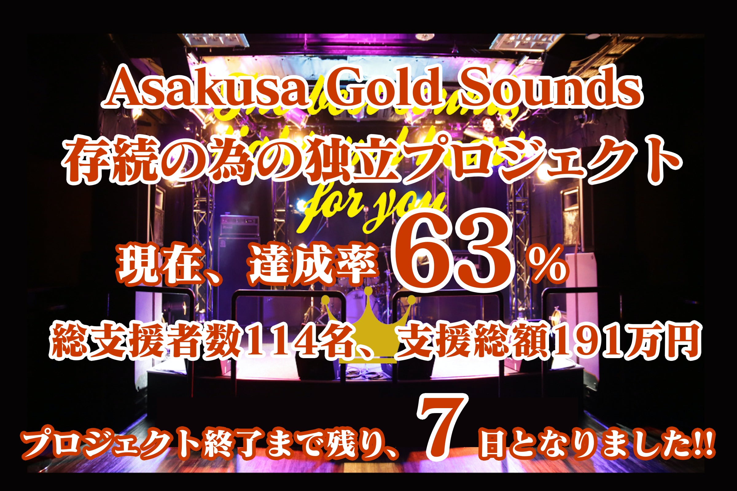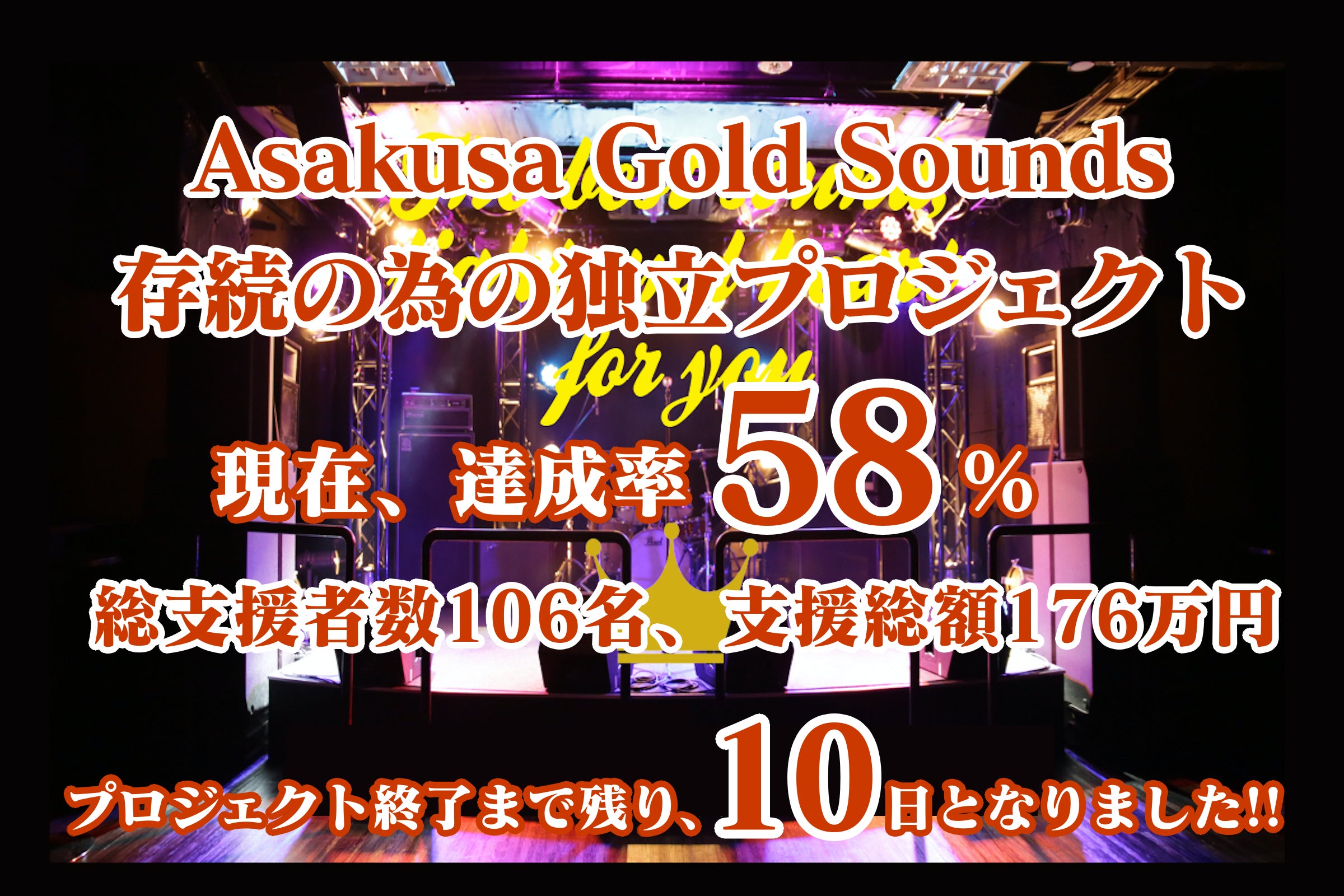 12/2にプロジェクトを発表開始してから多くの方からのご支援、拡散のご協力、応援メッセージ、有難うございます。12月30日までの短い期間でのプロジェクトにも関わらず、開始直後から多くの方から反響をいただき、現在残り10日にして、総支援者数106名、達成率58%、金額にして176万円ものご支援をいただきました。現在もご支援に添えて、応援の言葉をくださる方やメッセージを下さる方も多くおります。こちらの活動報告で改めて発表、告知などさせていただけたらと思います。今後も見通しのつかない情勢ですが、来年以降もライブハウスの火を灯し続けられる様、スタッフ一同、ひたむきに現場で音楽を発信し続けていきます。どうか、引き続き、ご支援ご協力のほど、宜しくお願い致します。Asakusa Gold Sounds