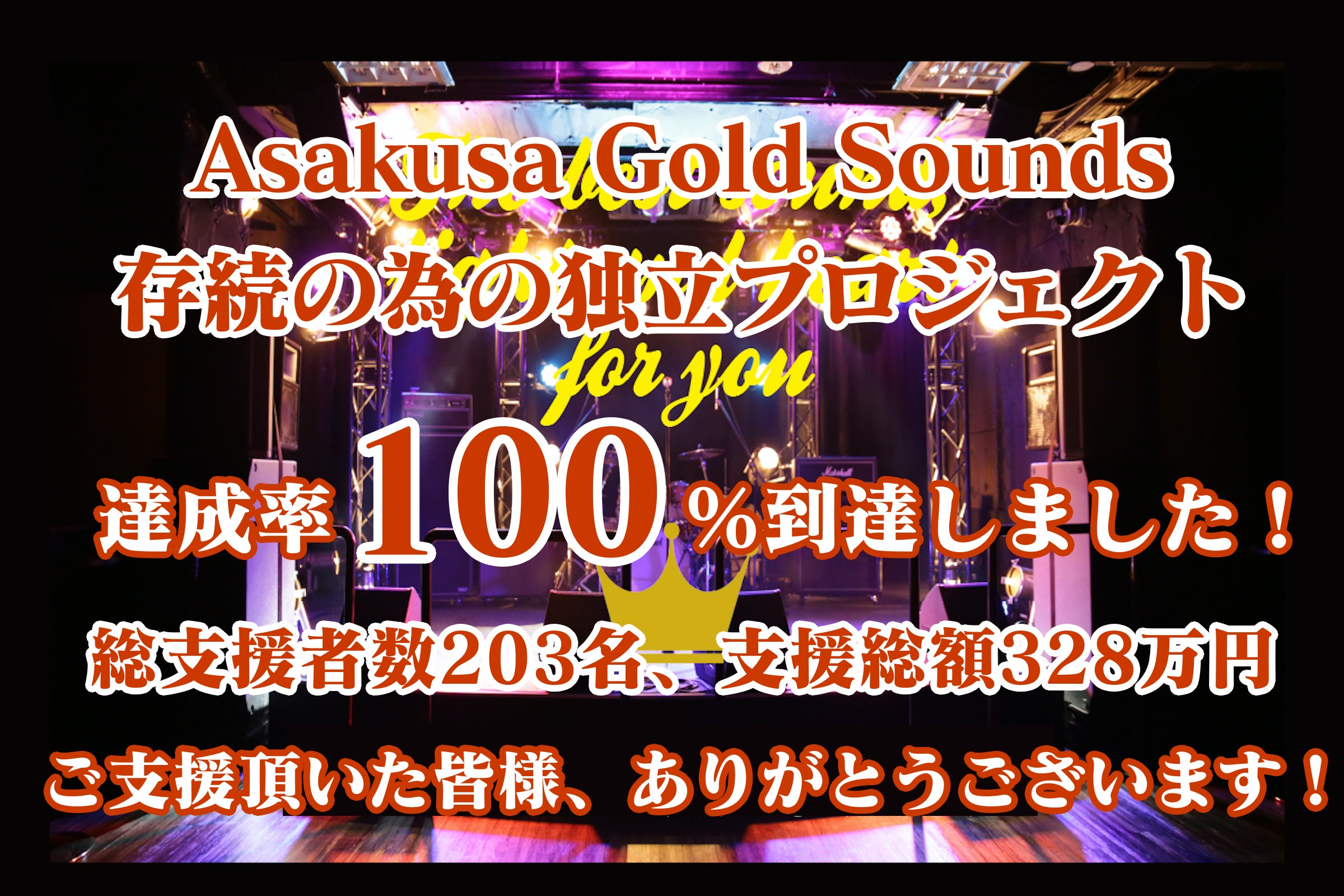 2020/12/30 16:16ご覧いただいている皆様、ありがとうございます。Gold Sounds独立の今回のプロジェクト、最終日の本日、達成率100%に到達いたしました。本当に沢山の方のご協力とお気持ちをいただいて、達成することができました。ご支援頂いた皆様、毎日のように拡散にご協力してくださった方や、応援メッセージをくださったアーティスト・ライブハウスマン達、クラウドファンディングは参加の仕方がよく分からないけど何かしたいよ。と連絡をくれた方、相談くださった方、きっとこのプロジェクトで初めてGold Soundsの事を知って頂いた方まで。スタッフ一同、心よりお礼を申し上げます。本当に、ありがとうございます。皆様に固めて頂いた足場、もらったチャンスを絶対に無駄にしないように、見通し付かない情勢でも踏ん張って、来年以降のイベントシーン作りにより一層力を入れて、Gold Soundsを存続させていきます。引き続き、宜しくお願い致します。----------------------------------------------------------また、クラウドファンディングとは直接関連はありませんが、本日12月30日と明日31日に、Gold Soundsで開催される、前夜祭とカウントダウンイベントの両公演を無料配信させて頂く事を決定いたしました。30日は有観客+無料配信ライブ、31日は無観客無料配信ライブとして開催します。報道で目にする数字の増加を受けて、来年1月11日までに期間が延長された営業時間短縮要請、公共交通機関の本数縮小の決定など、社会の状況とライブハウスを取り巻く状況の中で通常のカウントダウンライブが行えない状況になったこともありまして、本日は、20名限定でお客様入場有りと無料配信にて開催、明日は、感染拡大予防のガイドラインと時短営業に従い無観客&酒類販売無しの無観客配信ライブ公演として開催させて頂きます。カウントダウンならではのその場の空気とリアルでの体験の共有はできませんが、楽しみにしてくださった皆様と浅草のアーティストと同じ時間だけでも共有できたらと決めさせて頂きました。※緊急事態宣言下、自粛期間中と同様に最大限の予防・対策を行いつつ、31日は要請等に基づき、飲食店としての営業・酒類の販売提供は行わない形にて開催させて頂きます。▶︎Gold Sounds ツイキャスURL https://twitcasting.tv/goldsounds1特に、このプロジェクトをご支援頂いた方達へ、年末の忙しい時期ですが、Gold Soundsが誇れる、音、人、心の伴った、良いアーティスト達が集まりますので、お時間の都合合う方は是非ご覧になって頂けたら幸いです。※この二日間の無料配信に関して、人件費・運営費の補填としてアーティスト様にご理解いただき、Gold Sounds ONLINESHOP にて投げ銭を募集予定です。もし心動く瞬間がありましたら、お気持ち投げ銭いただけるとありがたいです。▶︎Gold Sounds ONLINE SHOP https://goldsounds.stores.jp/----------------------------------------------------------プロジェクト終了まで残り8時間。Gold Soundsは未来に向けて動き続けますので、最後の一押し。引き続き、ご支援ご協力のほど、宜しくお願い致します。 もっと見る