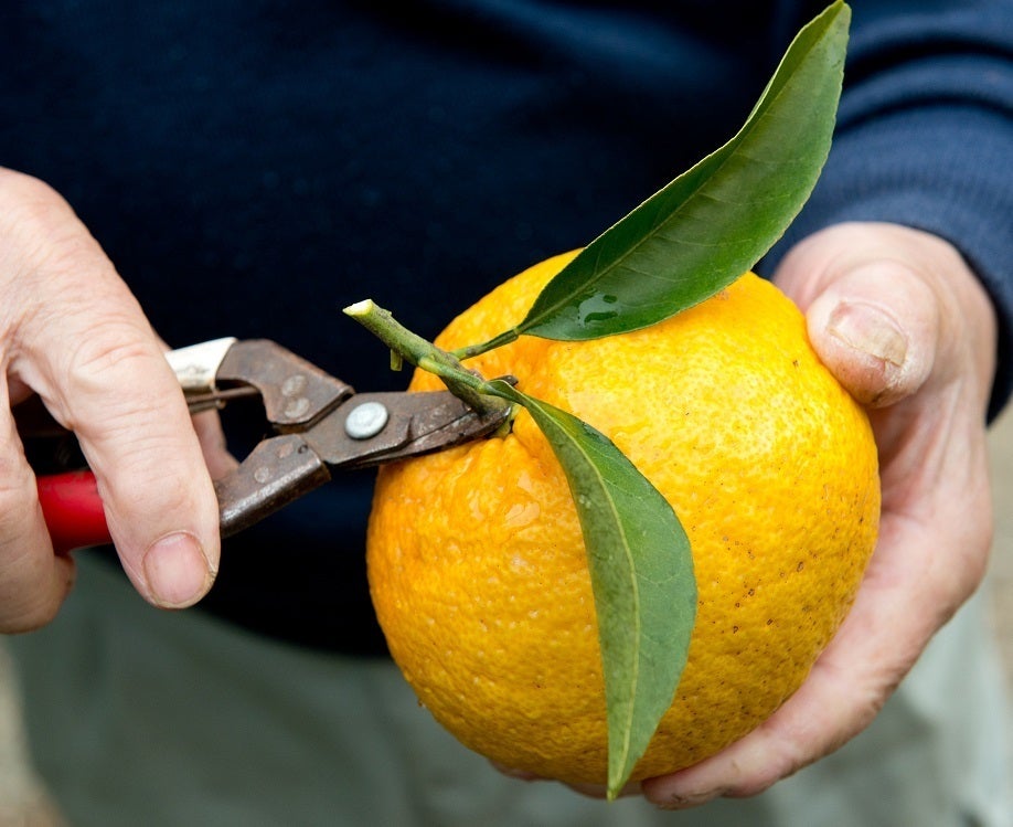 甘夏は通常一旦収穫し、低温貯蔵で減酸させて出荷するものがほとんどですが、能古島の甘夏は収穫直前まで樹に成らせたままの状態で熟すのを待ちます。これを「樹成り」といいます。樹で完熟の時をじっと待ち、最高のタイミングで収穫される甘夏は、甘味と酸味のバランスが良く絶品です。樹に成らせておく時間が長いため傷も付きやすくなりますが、それが「樹成り」の証拠です。