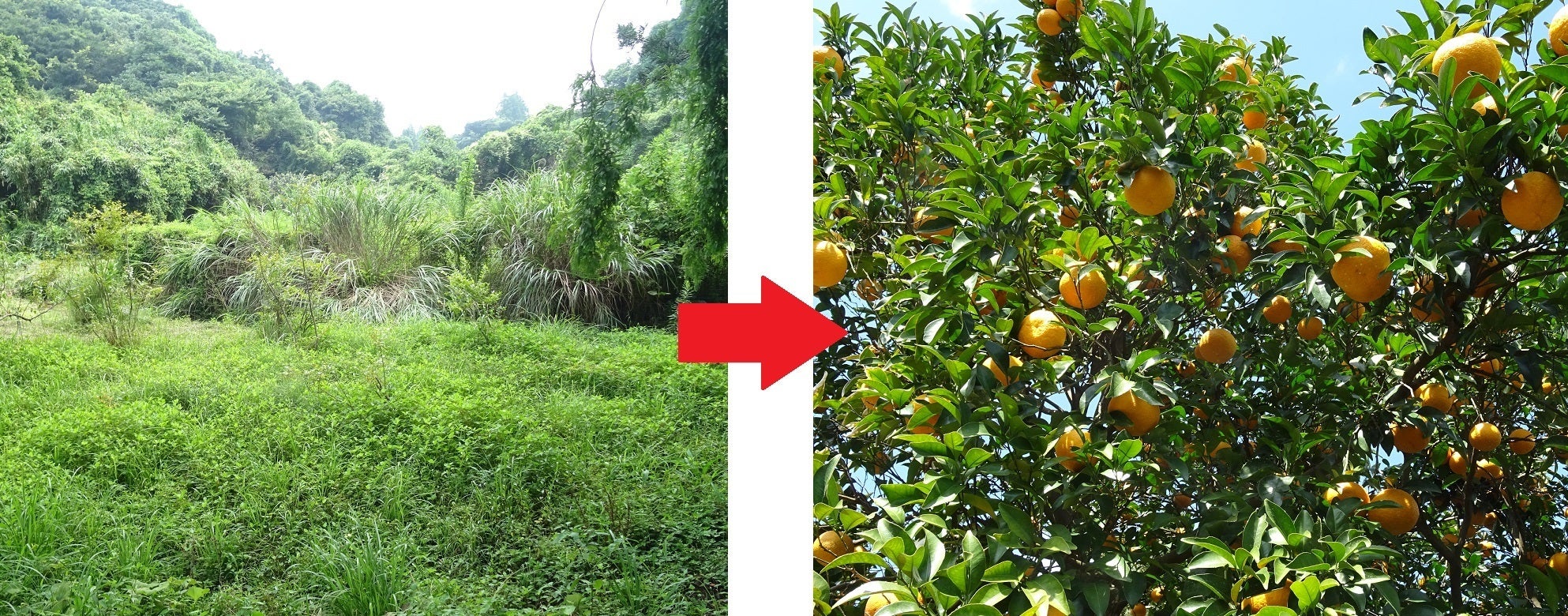 現代、少子高齢化、跡継ぎ不足により、10年先には皆さんに甘夏を届けることができなくなるんではないか?畑が荒れていくのではないか?という考えから、今回の大規模な耕作放棄地再生計画をやってやろうと決意しました!