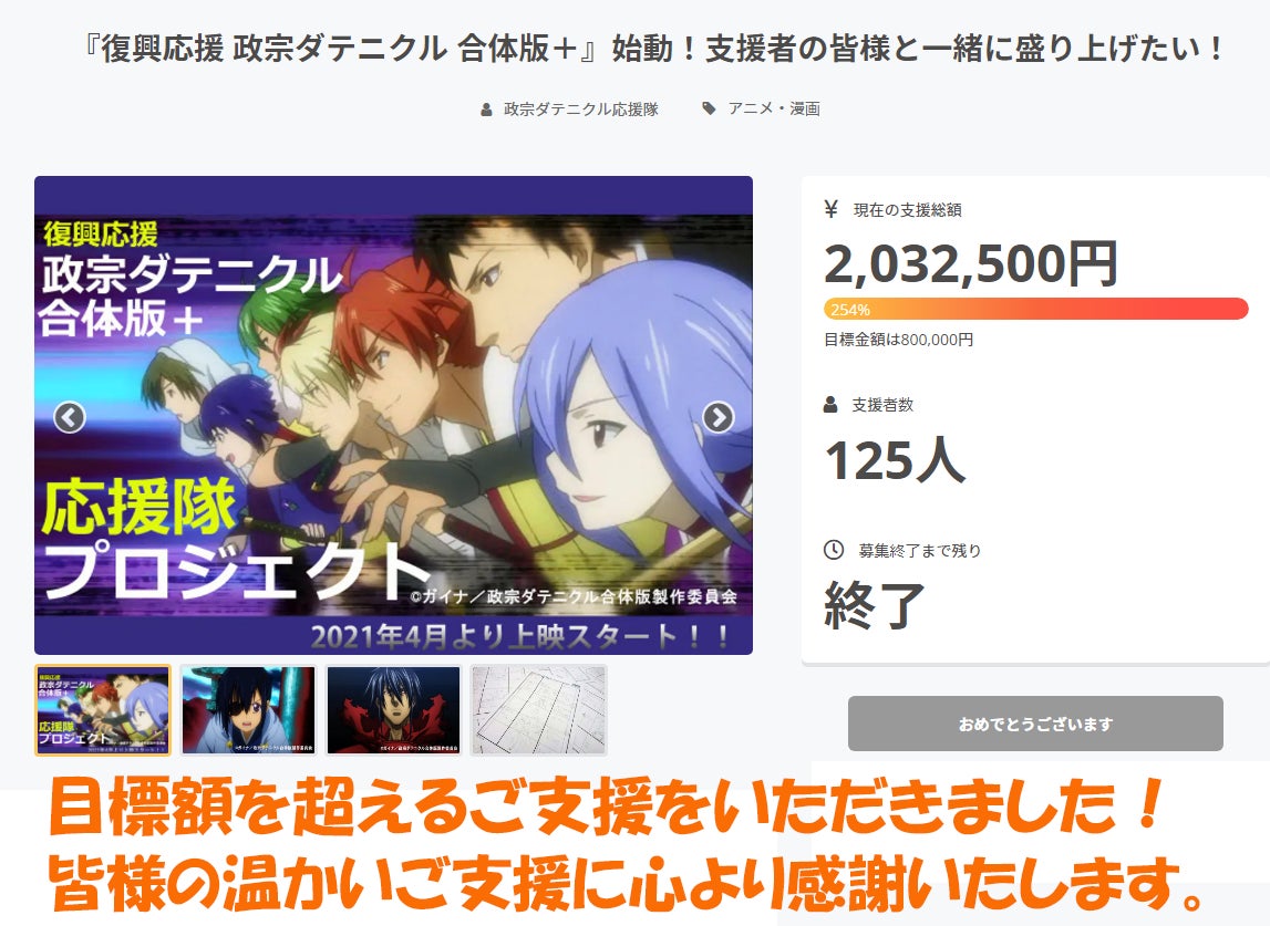 『復興応援 政宗ダテニクル 合体版+』始動!支援者の皆様と一緒に盛り上げたい!クラウドファンディングのプロジェクトは、2020年12月24日に募集を開始し、125人の支援により2,032,500円の資金を集め、2021年1月31日に募集を終了しました。