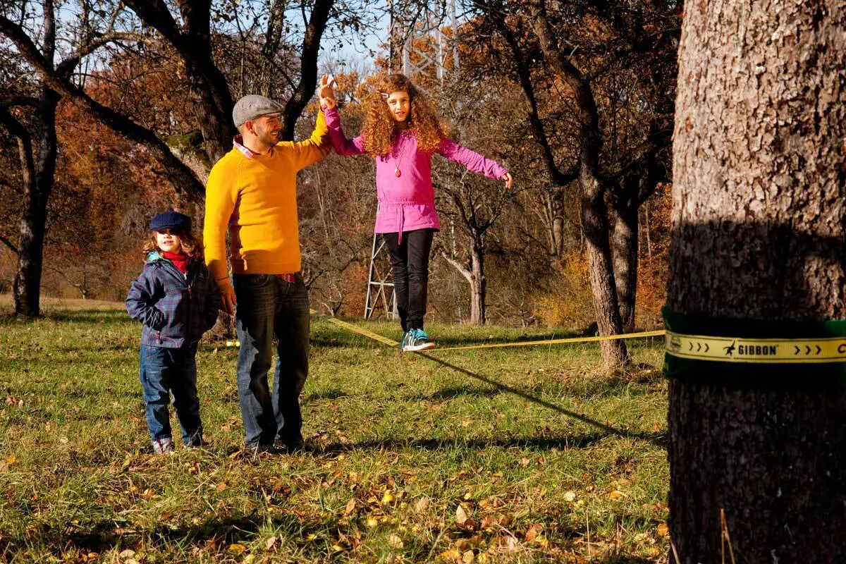 元々は、海外のクライマーたちが木の間にロープを張って遊んだのが起源ともいわれており、2007年にドイツの会社(GIBBON SLACKLINES社)が、誰もが簡単に気軽に楽しめるようにと製品化されたのが、ヨーロッパ諸国を中心に広まり、2009年日本にも渡ってきました。