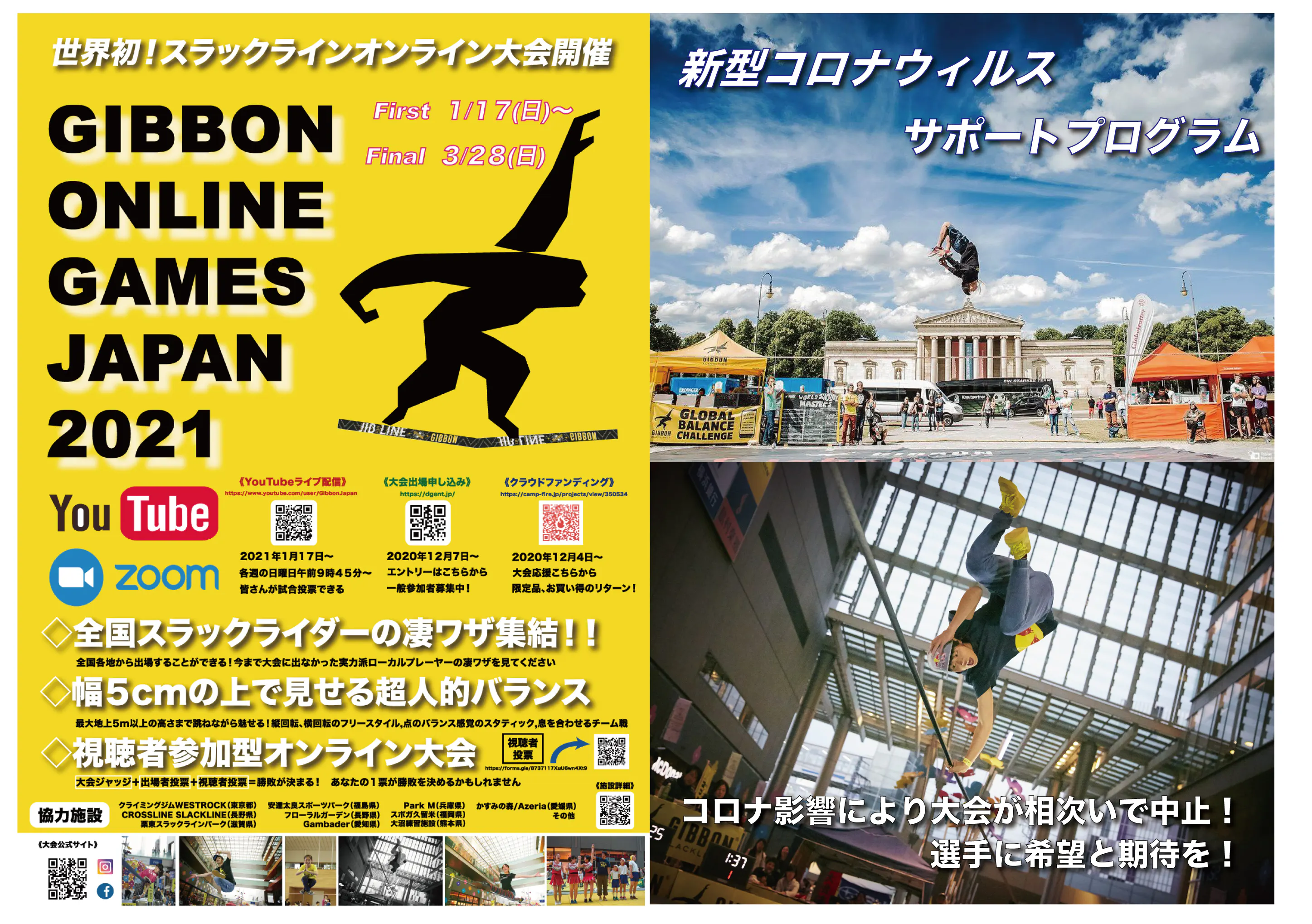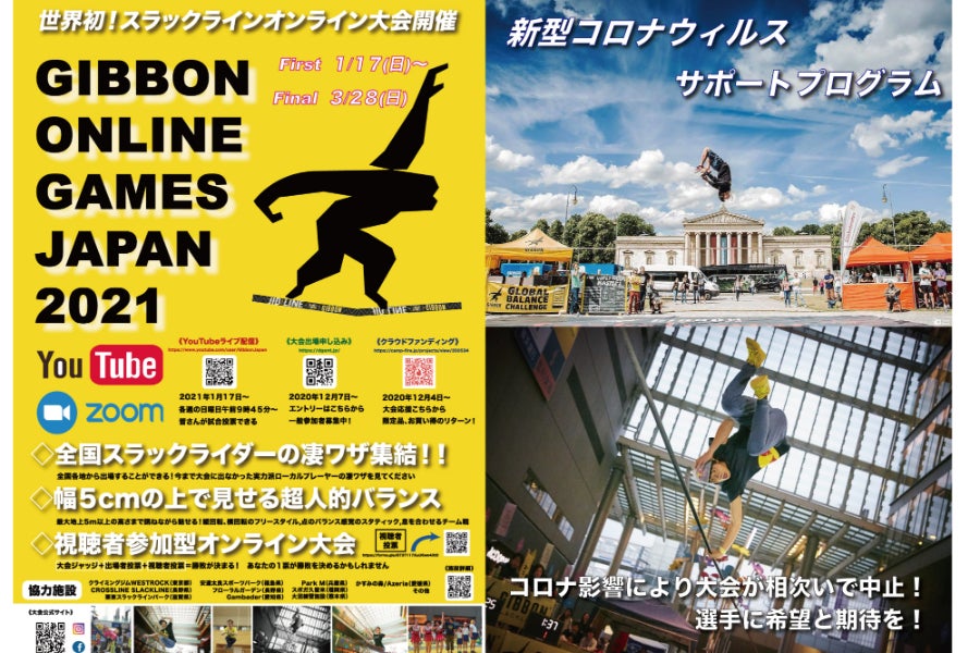 新型コロナウィルスの影響により、外出自粛期間が大きく影響し、メーカーとしてはスラックラインの売り上げが激減いたしました。また、毎年開催されていたGIBBON CUPという日本で定期開催している大会全てが中止となり、メーカー所属ライダー及びサポートライダーたちの活躍する場面がなくなりました。そういった中、オンラインのシステムが発達したことやクラスター発生予防を含む感染予防の観点を含めて、世界で初のオンラインによるスラックラインの大会を開催し、ライダー及び全国各地で練習しているスラックライン愛好者たちが”大会(目標)”という一つの希望や期待が持てるようにしたいと思いました。