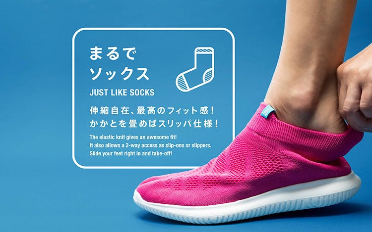2020年グッドデザイン賞受賞。ソックス+シューズ。誰もが履ける新感覚プロダクト。はだし履きが気持ち良い伸縮自在のフィット感で、かかとを踏めばスリッパの様な使い方もできます。コンパクトにたためるので持ち運びも自由自在。洗濯機で丸洗いもでき、ラクラクお手入れで、いつも清潔に保てます。