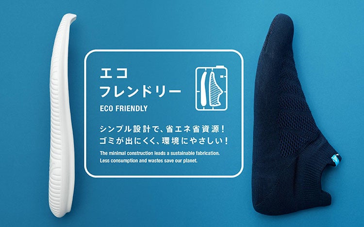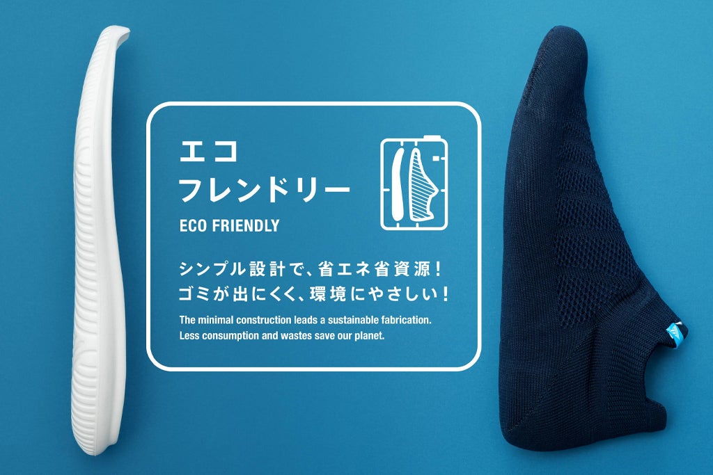 最小限な製造工程、アッパーとソールによるミニマム構造により大幅な廃棄材ロスの削減、 製造工程の短縮が可能となったエコフレンドリーなデザインです。