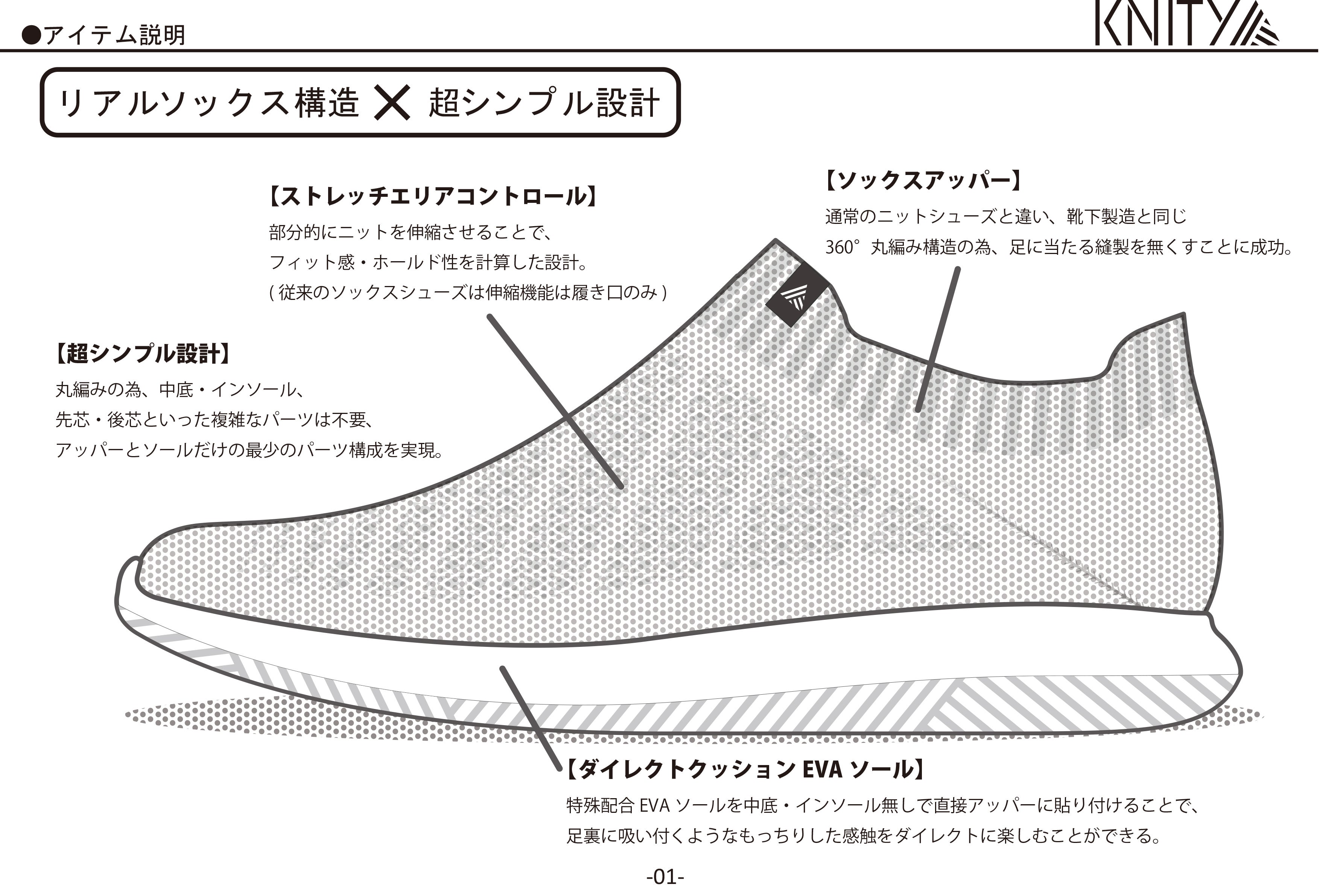 そこで老若男女の様々な足型にフィットする伸縮性と部分保型を両立した、新感覚の 履き心地のニットアッパー「KNITY」を開発致しました。