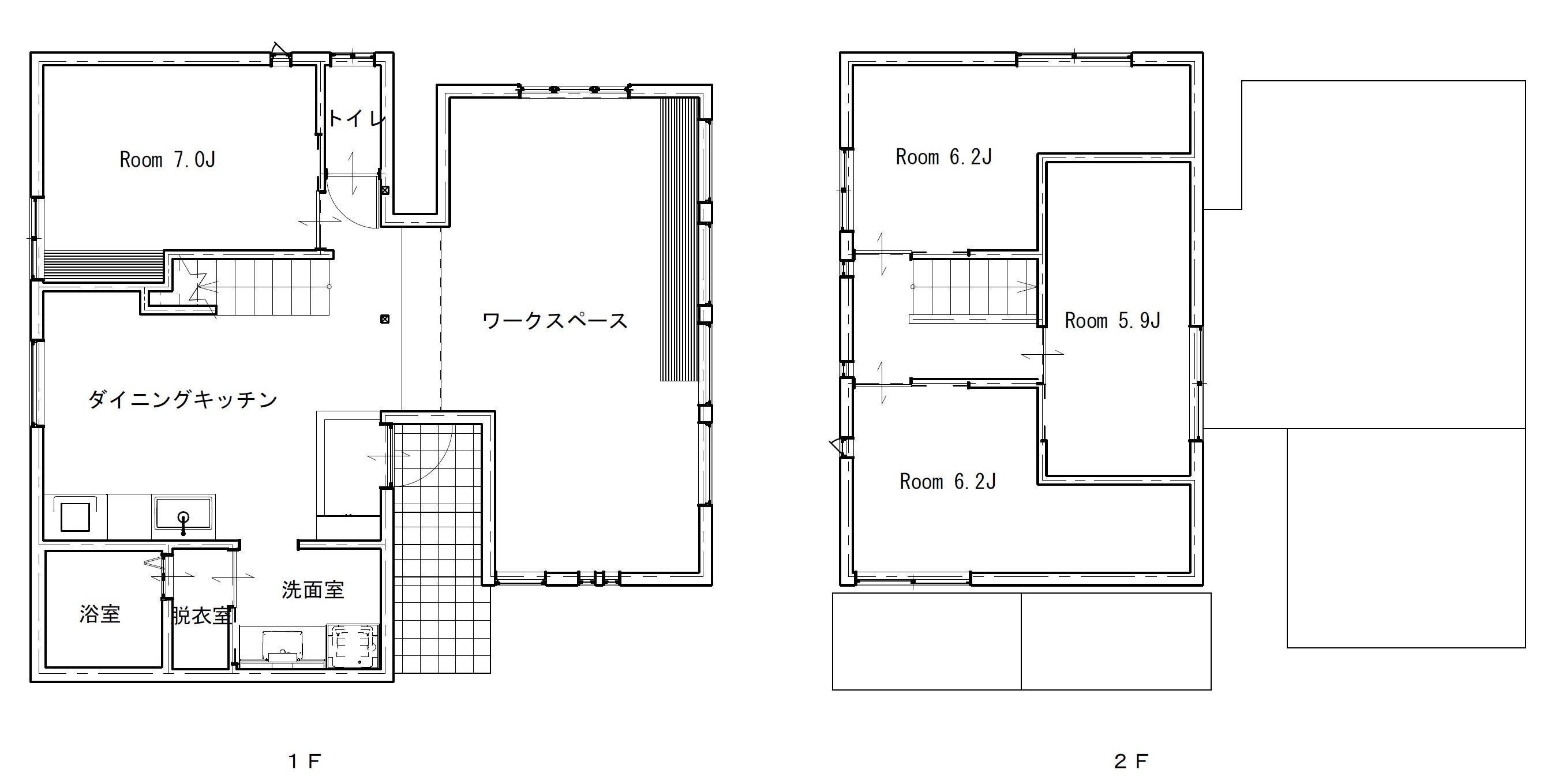 居室は全部で4つで、1階には共用の水廻りとワークスペースを設けています。