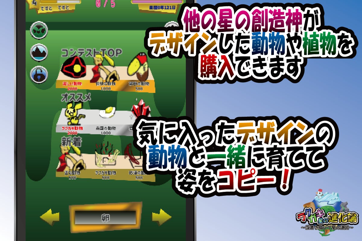 星の創造神として動物や植物をデザインし、ゲームが進む事でコンテストに参加したり、他のプレイヤーが描いた動物と一緒に育てられます。