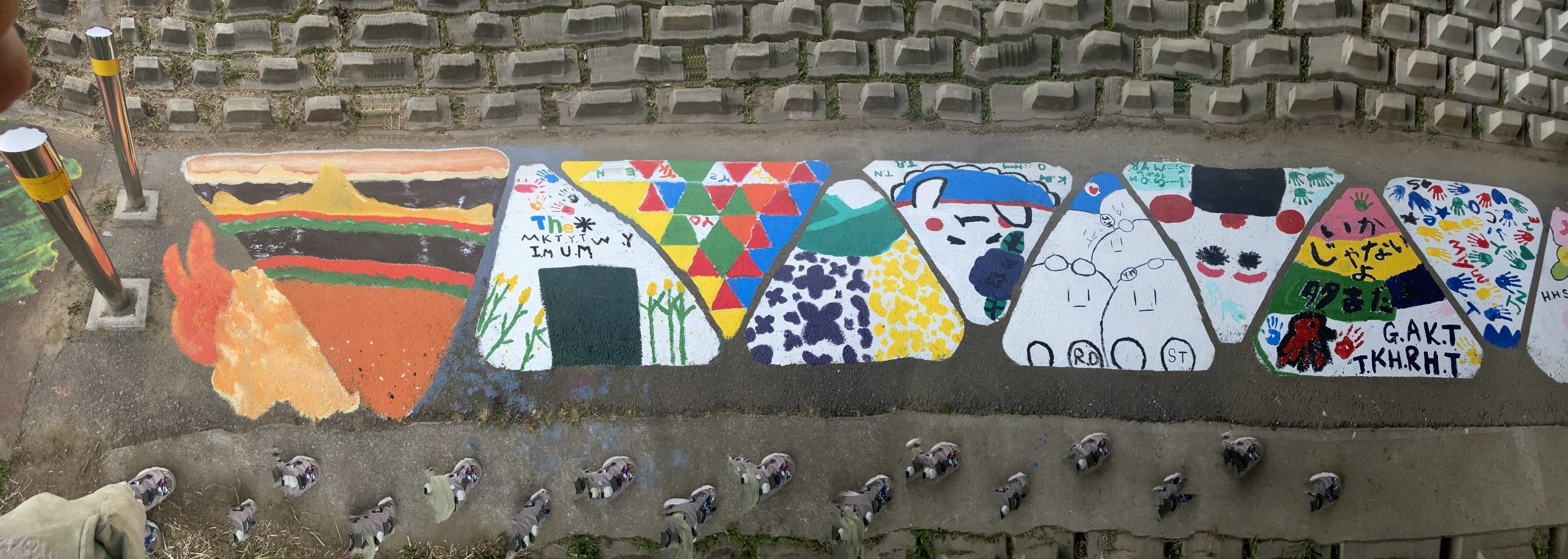第2駐車場から川側を通って多古駅へ向かうルートに、黒板アートの鈴木らなさんと一緒に多古高校の美術部の学生さん達が大きなお弁当の絵を描いてくれました