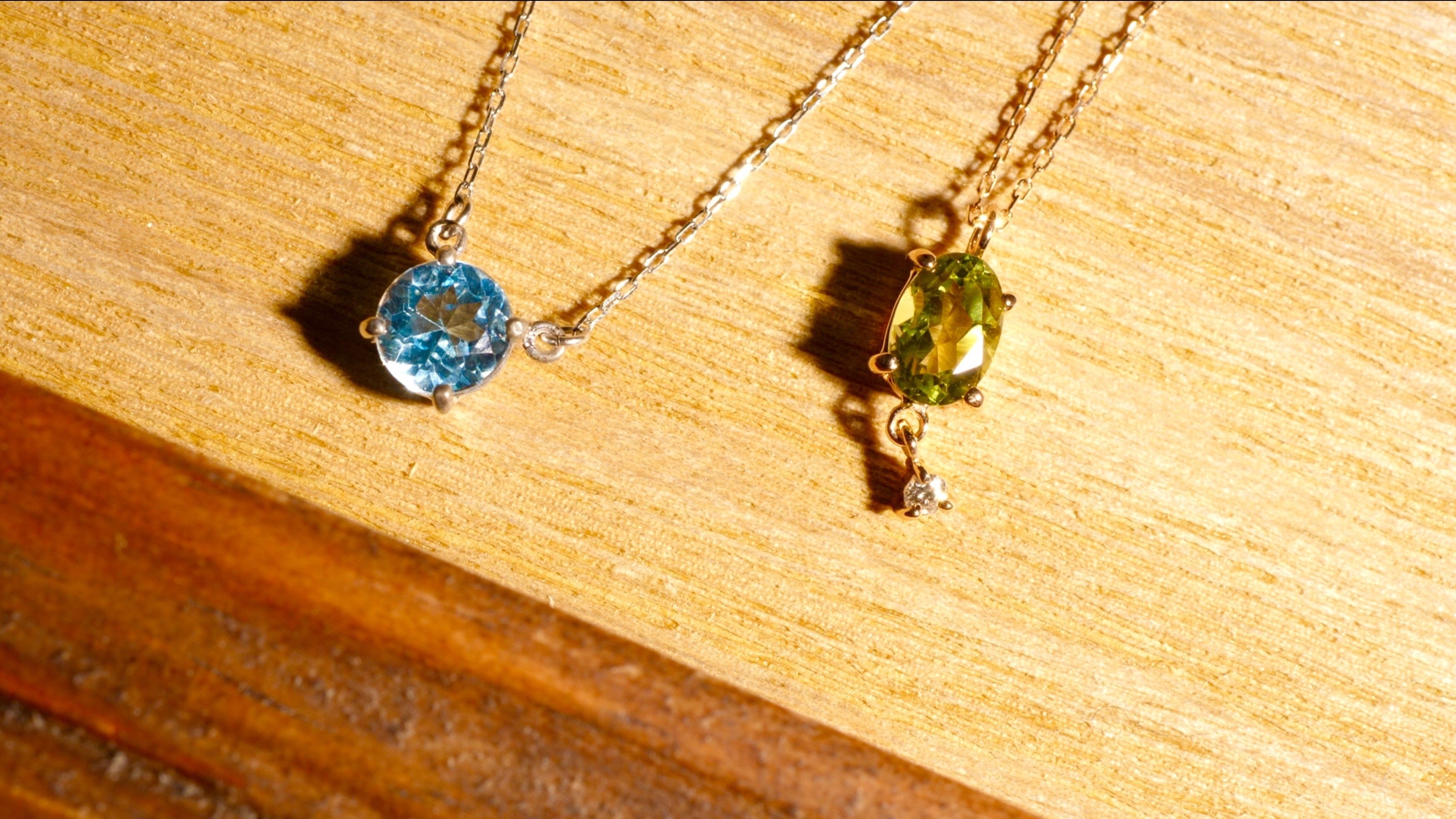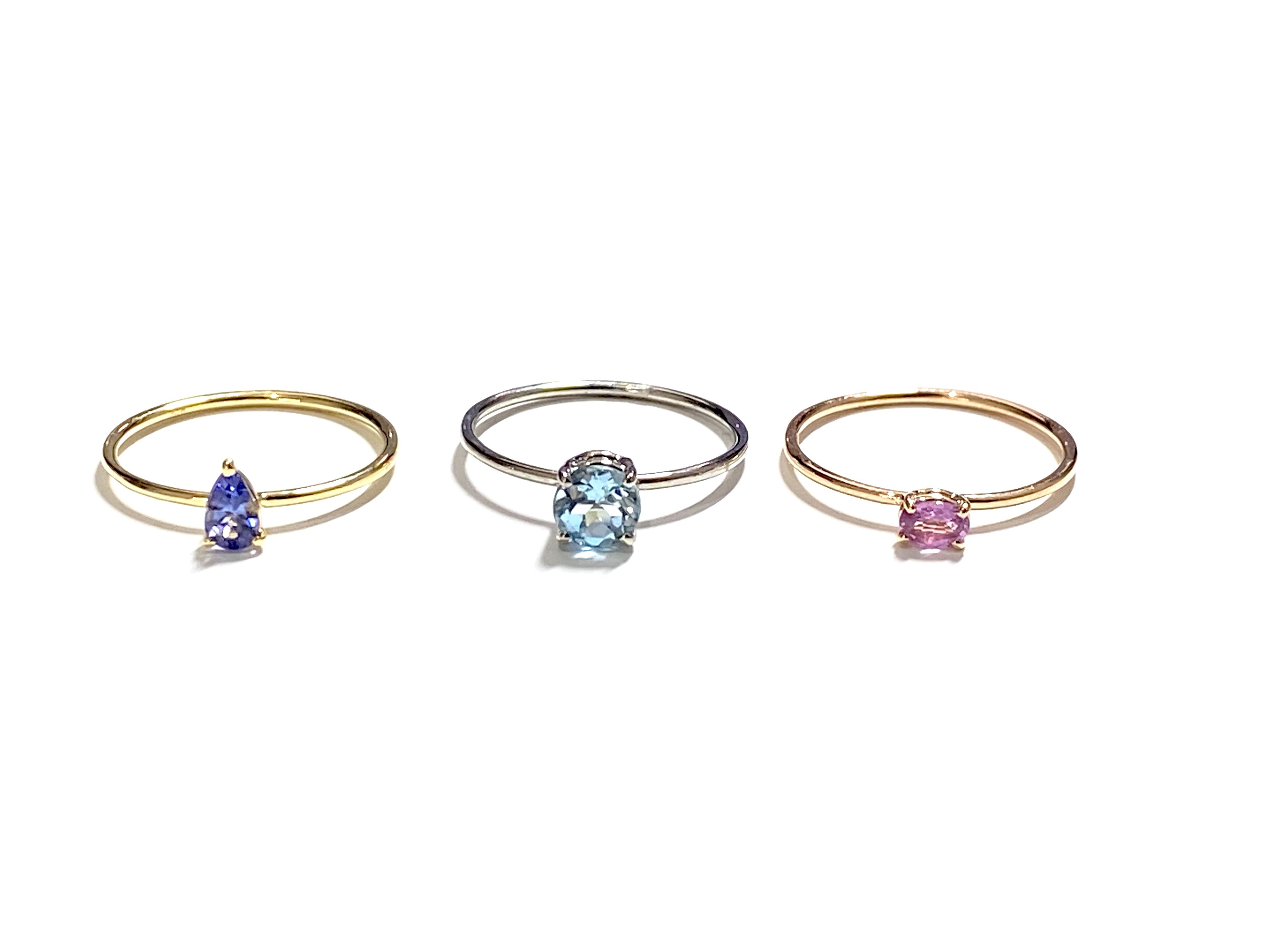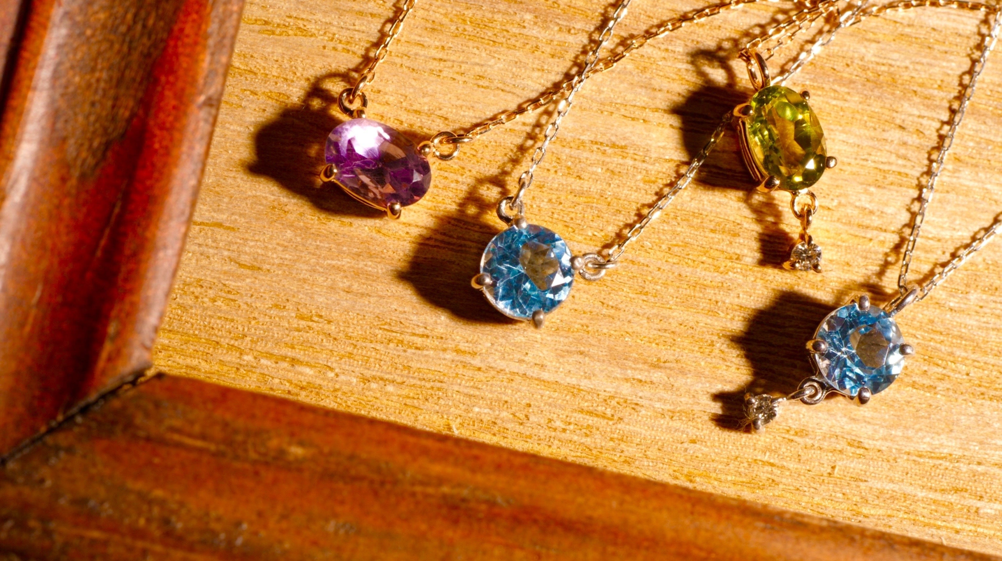 宝石の種類は「ブルートパーズ」「ペリドット 」「タンザナイト」 「アメジスト」「ピンクサファイア」