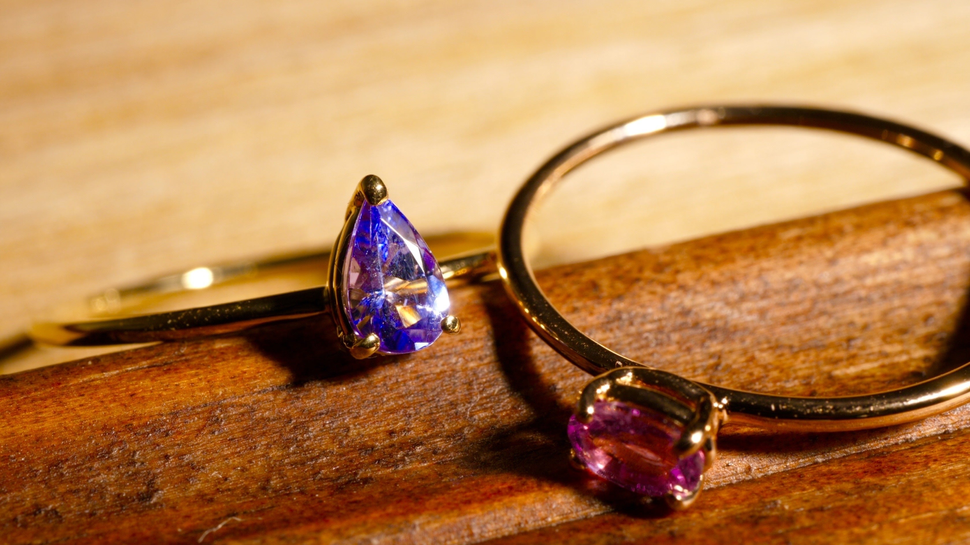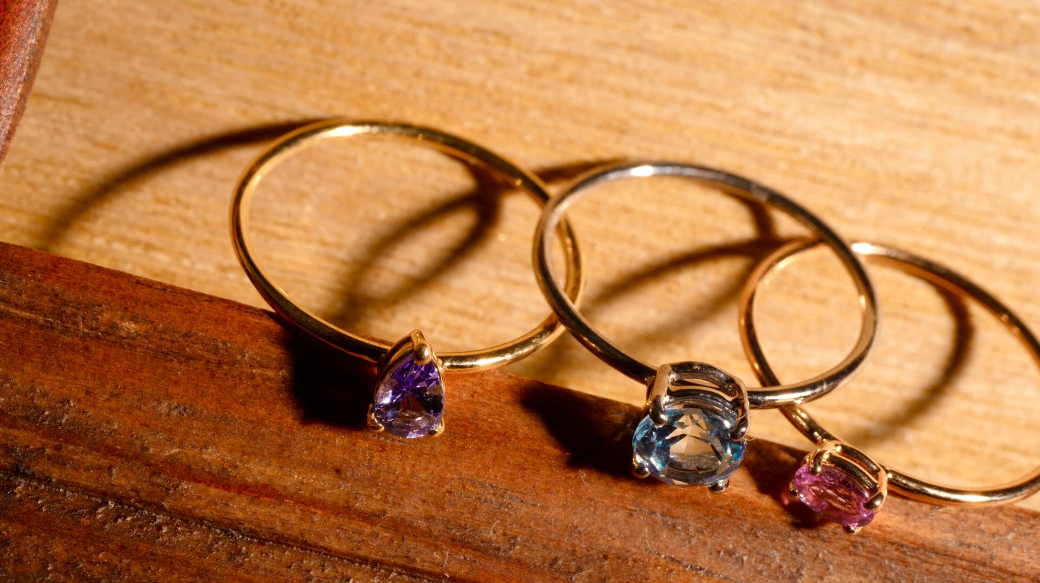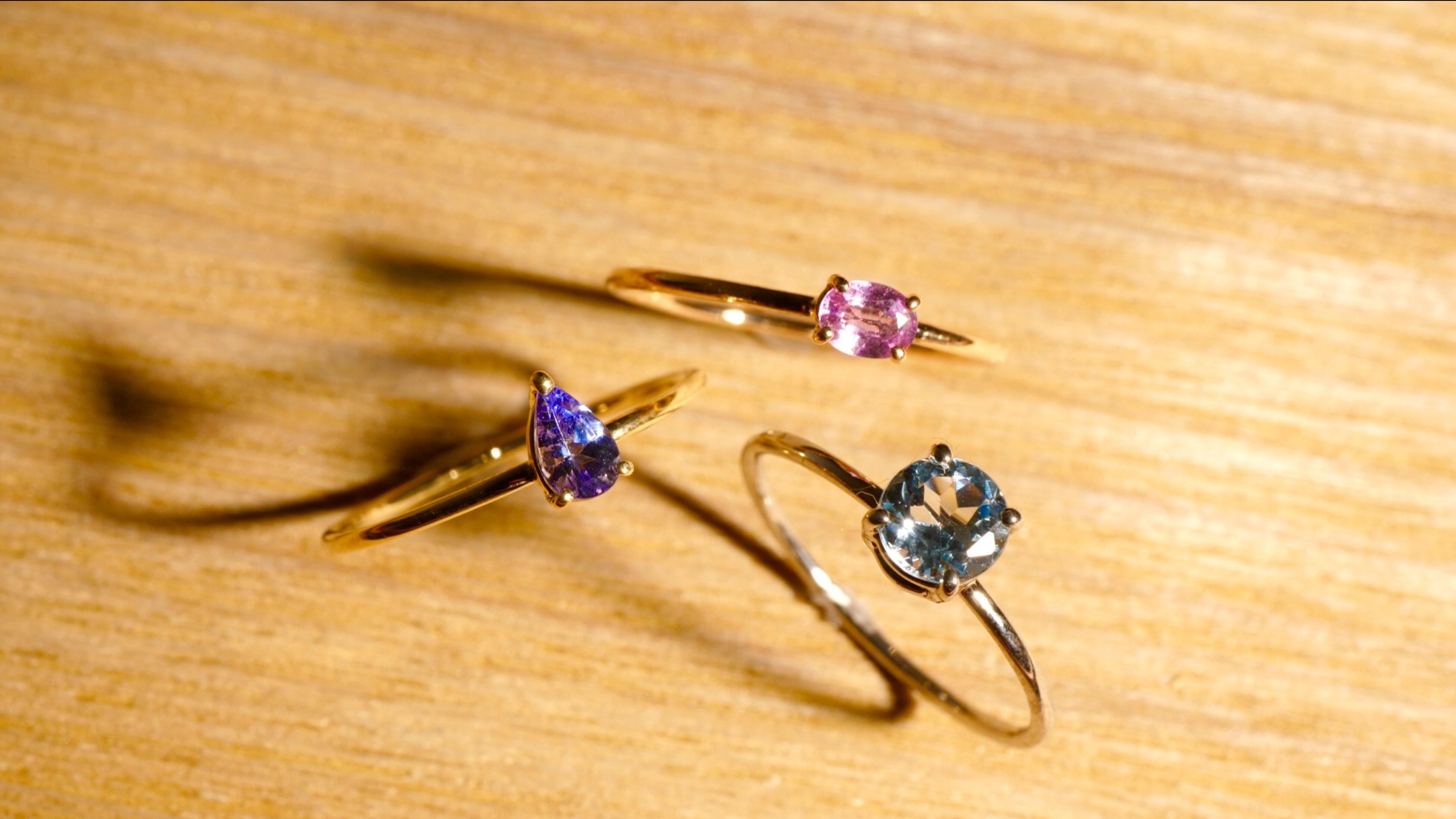 宝石の種類は「ブルートパーズ」「ペリドット 」「タンザナイト」 「アメジスト」「ピンクサファイア」