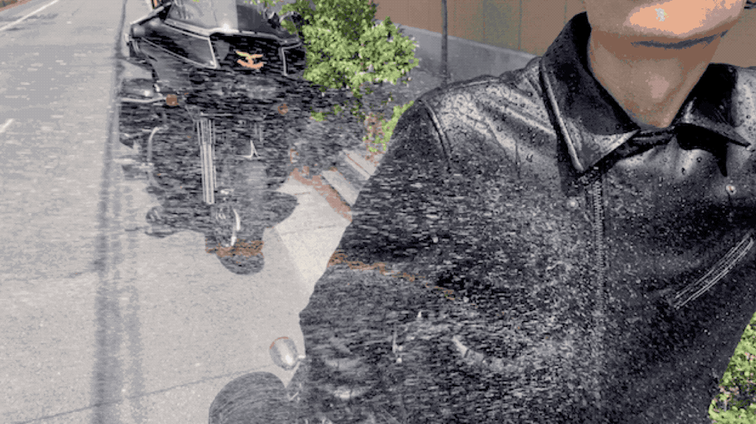 日本で販売されているレザー製品には、シープレザーとラムレザーの違いをラムレザーと表記しているものが多々見られますが、本製品は厳選したラムレザーを使用しています。衣料用レザーに耐水加工を施した製品はこれまでにありません。カバンや靴等は革素材が硬質なために防水が可能です。また軽撥水加工を施したものはありますが、時間の経過により裏側に浸水します。何よりも本製品の魅力はラムレザーの特徴である柔らかさとストレッチ性を有しながら、完全な耐水加工製品であることです。バイクのツーリングにもストレッチ性が機能します。タウンウェアーとしてメンズ・レデースのファッションアイテムに多用途な着こなしができます。また、気候の変動で起こる急な雨にも安心して着用して頂けます。