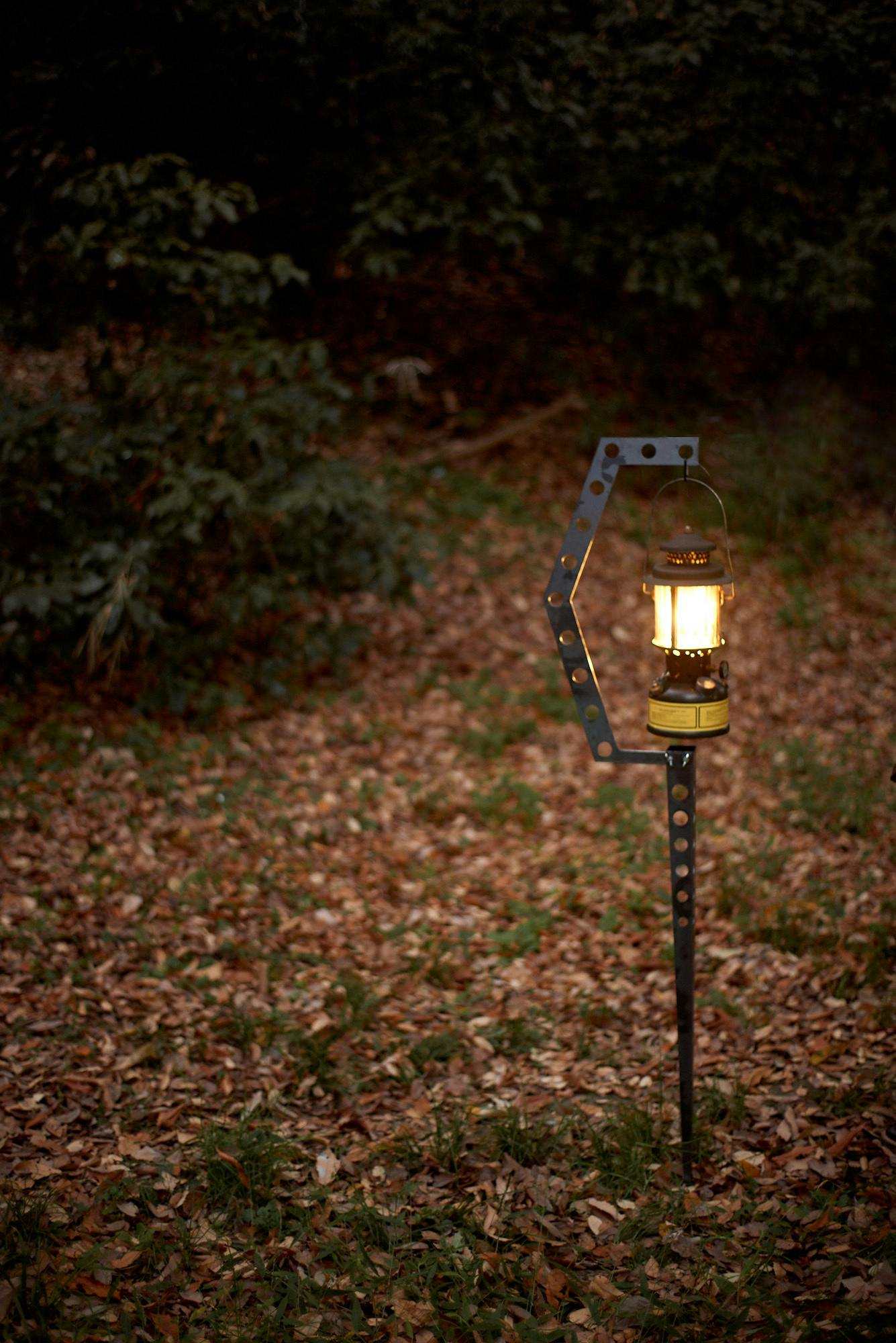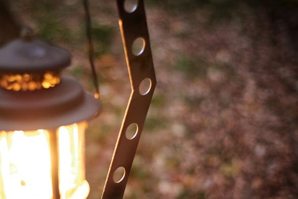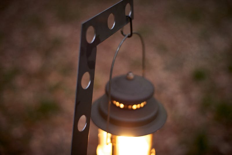 お気に入りのランタンに灯るあかりをスタンドがまとい、無骨なのにどこかやさしく光る姿は思わず時間を忘れて見とれてしまう光景です。手入れを繰り返し黒皮の艶が増したり、錆がでて表面に凸凹ができたり。ご自身の好みに合わせ、唯一無二のキャンプギアに育ててください!