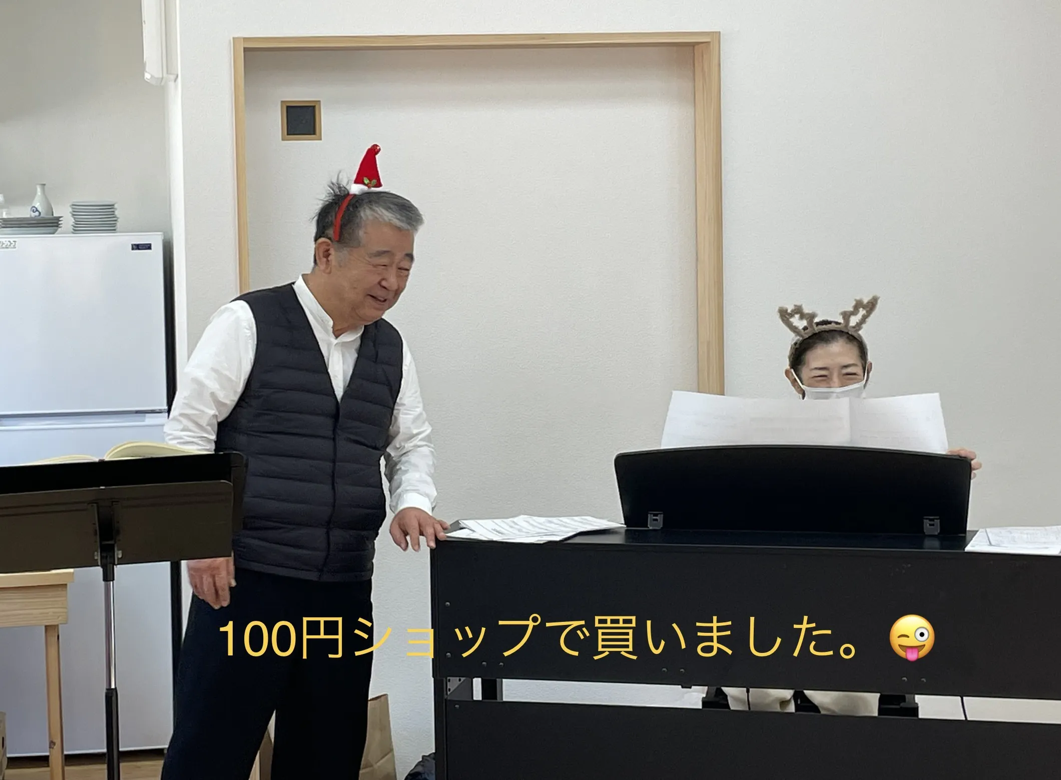 写真に写っているクリスマスのカチューシャは、100円ショップで購入。(みなさんにかなりウケました。笑)