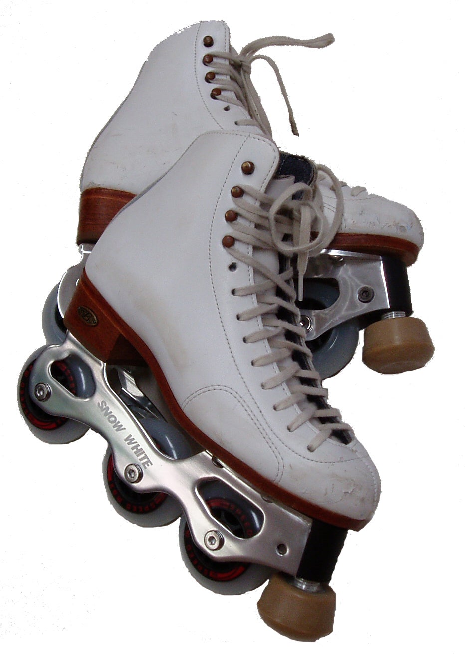 この競技は日本では大変マイナーな競技だと思われます。使われている靴は以下のような構造で、アイススケートのフィギュアの靴に以下のような専用のインラインフィギュアのブレードをつけて使います。