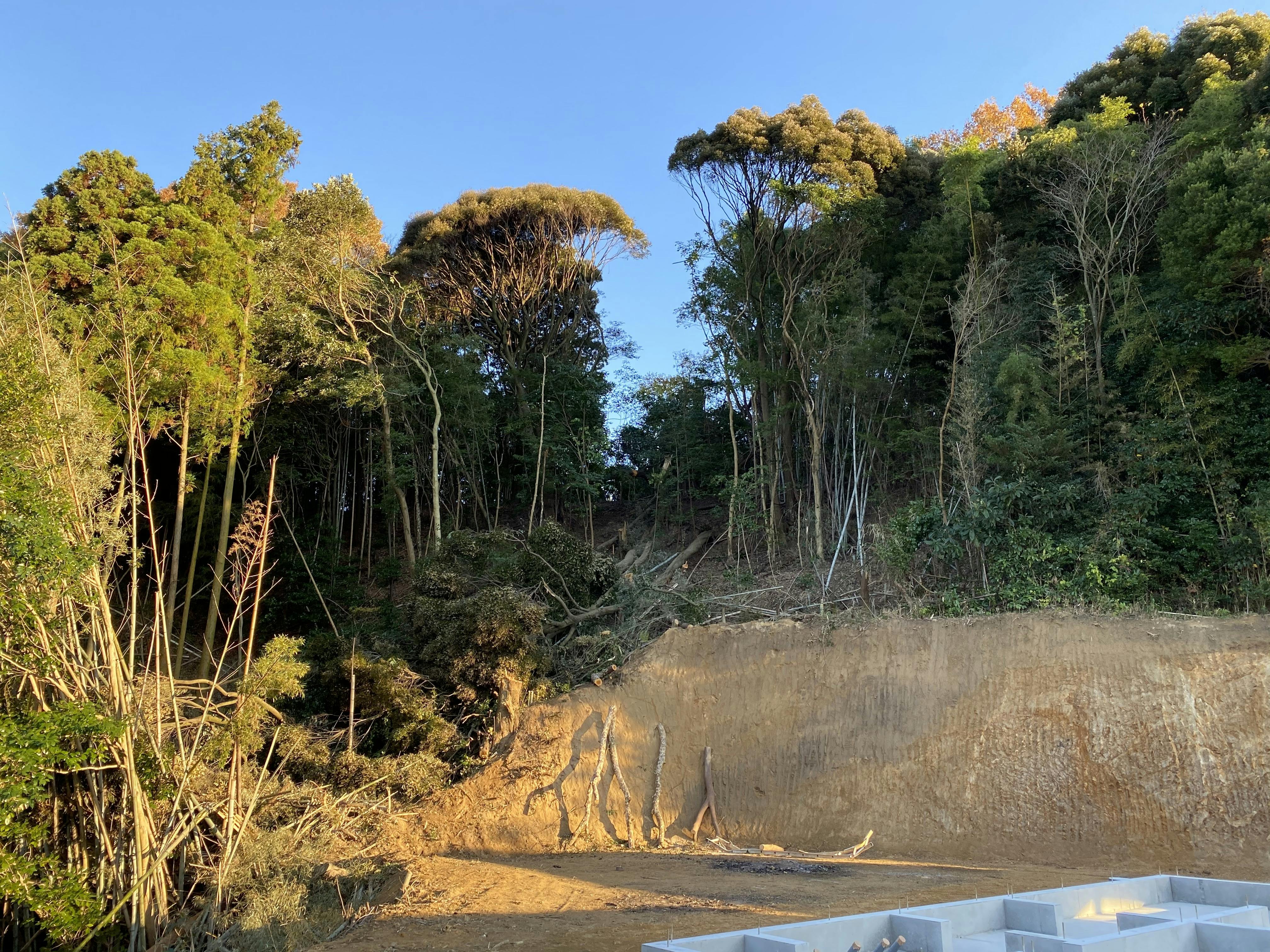 そこで、まずは自宅周りの木々を伐採する事から始めました。竹や小柄な木など、自分たちで切れるものもありましたが、大木は業者依頼が必要となり、重機での伐採作業もしています。