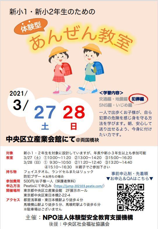 その第一歩として、春から一人で通学するようになる新小学1年生とまだ一人の通学に不安が残る小学2年生を対象とした、危機を体験する「体験型の安全教室」を企画しました!