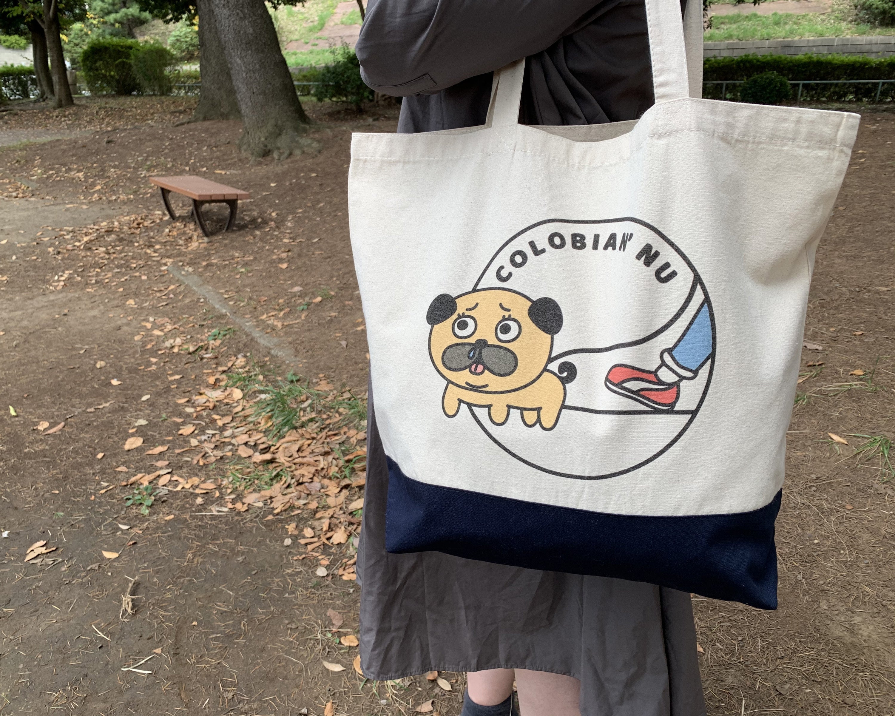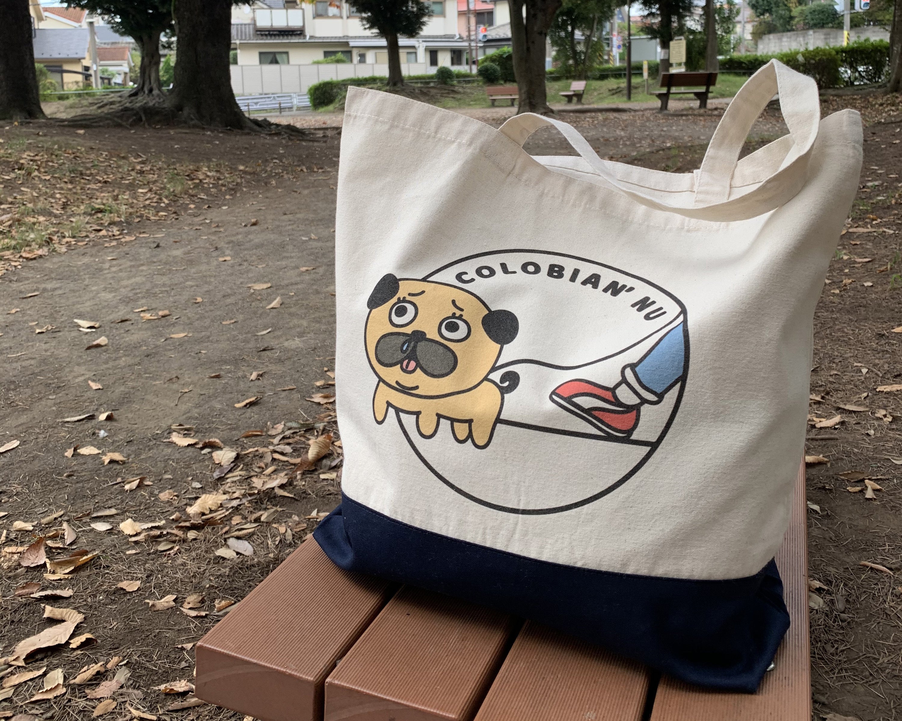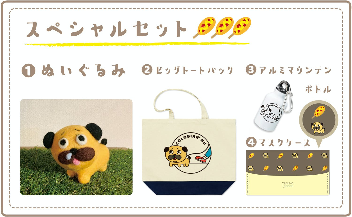 ぬいぐるみ、ドリンクボトルに加えて、厚地で買い物や行楽にぴったりのビッグトートバックと、コロビアンヌ好物のアメリカンドッグがイラストされたマスクケース付き。