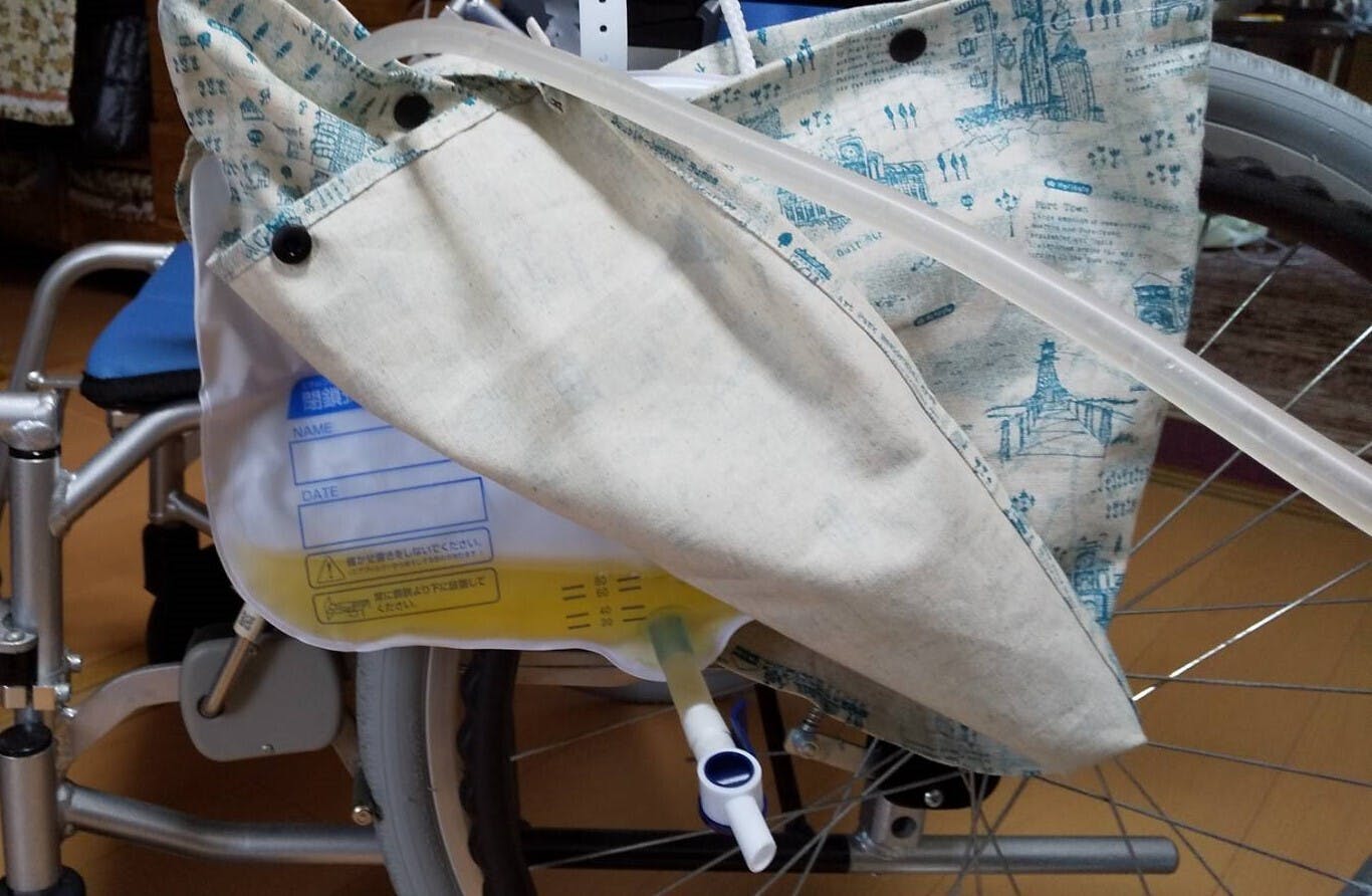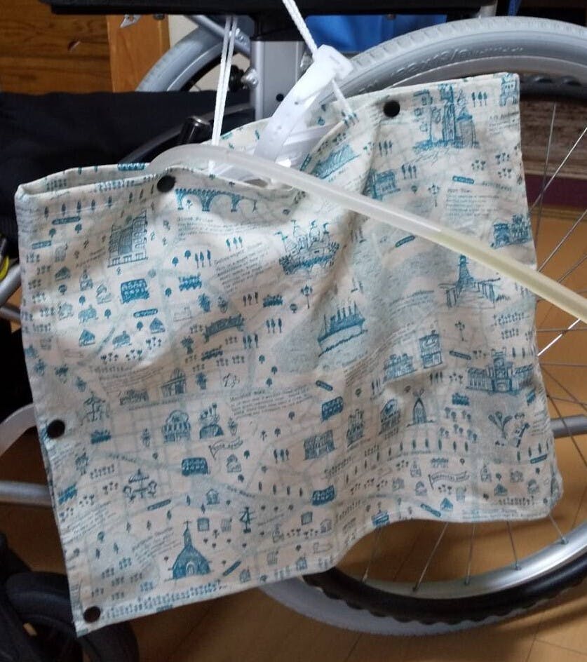 特別養護老人ホームは要介護3以上の認定の方が入所されていますので、臥床か車椅子移乗で蓄尿バッグを使用している入居者さんが必ずいらっしゃいます。介護用品メーカーの商品でバッグのカバーもあるのですが、高価で、例えば身寄りのない方には家族が手作りするでもなく、多忙な介護スタッフが適当な袋(¥100ショップで)などあるものでその場をしのぎ、外出したりしています。あると嬉しい用具です。尿破棄がしやすいようにボタン止め、歩行できる人には吊り下げの肩紐をつける、車椅子は背もたれ後ろにつけられるように紐をつける、等、タイプ別に製作します。