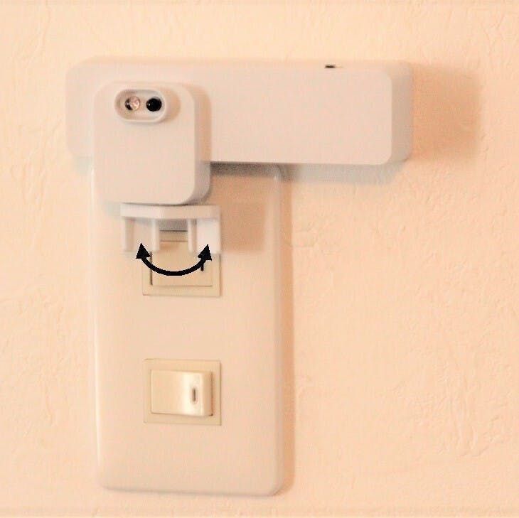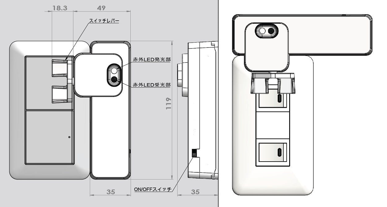 本体正面にある赤外LEDから微弱な赤外光が点滅発光しています。手をかざすと反射した赤外光を受光センサーが検知、内臓マイコンが反応してサーボモーターを駆動しスイッチレバーを動かす、というとても簡単な作動原理を利用しています。 良くあるスマホのアプリで...など面倒な設定もありません。