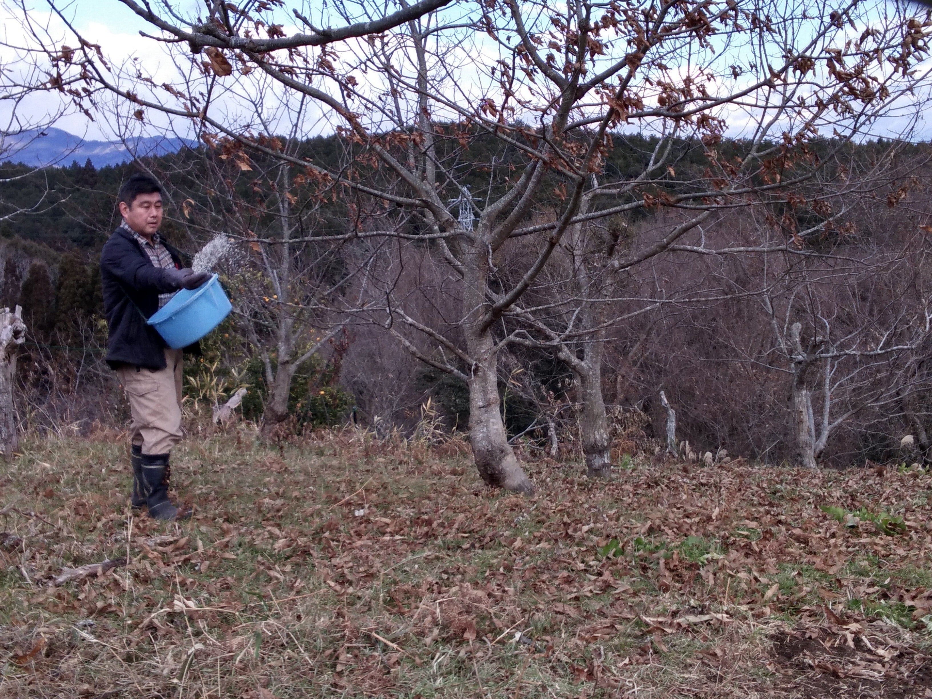 植え付けを行いましたまずは土を掘り起こして、根の6割程度を地中に入れ4割ほど地上に出るように埋めます。そしたら、たい肥を与えさらに土をかぶせしっかり踏み固めます。最後はシカやイノシシにかじられないようにビニールでガードします。