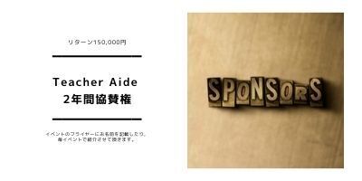 1年間Teacher Aideのイベントフライヤーやパンフレット、当日の配布資料などに協賛として名前やロゴを入れさせて頂き、イベント時にも紹介させて頂きます。イベントはTwitter、インスタグラム、FacebookといったSNSに加え、Peatix等のイベント管理サービスを最大限に利用して告知していきます。その段階でも協賛として提示していきます。Teacher Aideのイベントは全国各地(32支部:2020年12月1日現在)で開催されており、全国にお名前や活動を広める一助となると考えております。学校の先生や学生などの教育関係者を始め、多くの人に拡散できます。その他、ご要望がありましたら、柔軟に対応させて頂きたいと思います。