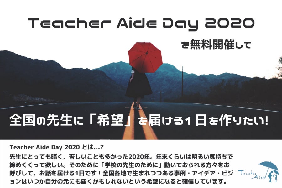 学校現場はまだまだ暗いニュースも多く、周りを見ても、SNSを見ても、悲鳴をあげている先生にたくさん出会います。私たちTeacher Aideもこの2年間で何かできたかといわれるとあまり何もできていないかもしれません。しかし、日本各地には先生の希望にもなりえる動き、事例、アイデアが出てきつつあるのも事実です。その希望を多くの先生に知って頂くことで、少し明るい気持ちで2020年を締めくくり、2021年を迎えて頂けたらと考えております。