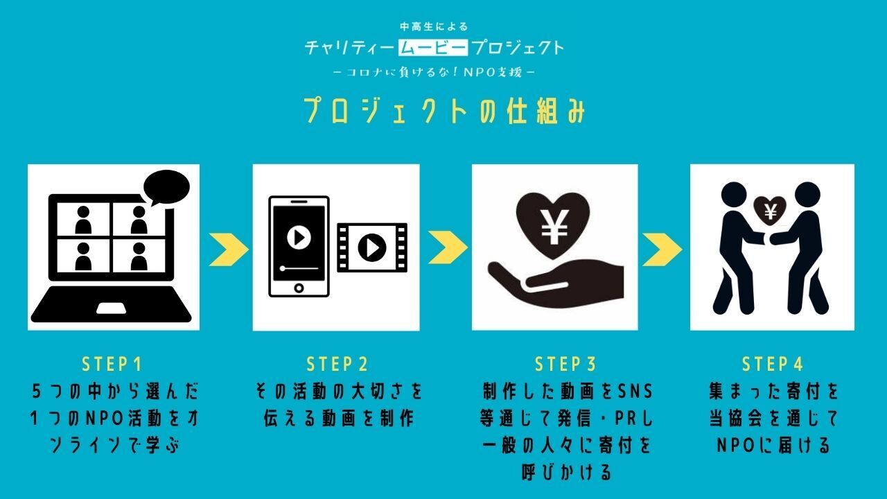 「次世代育成×コロナ禍のNPO支援」を掛けあわせた、コロナ禍で奮闘するNPOを応援するため、中学生・高校生がオンラインで寄付の意義やNPOについて学び、募金を実践するプロジェクトです。