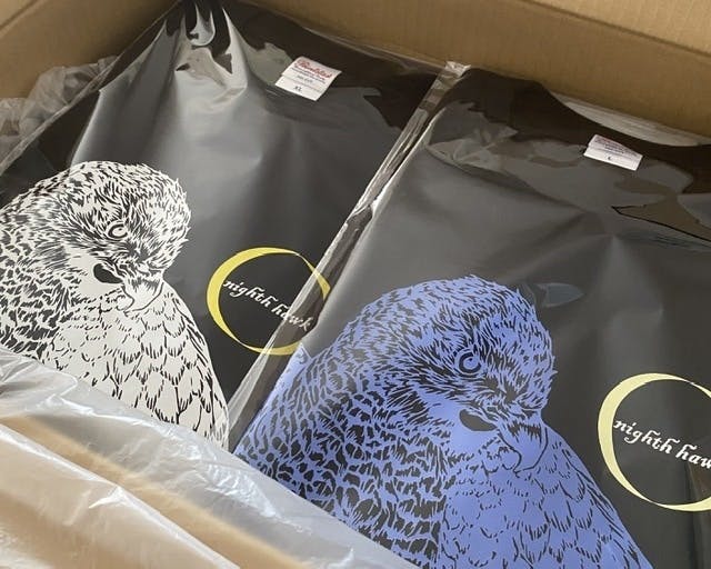 さて、リターンの1つである、【ナイトホークオリジナルTシャツ】が出来上がりました。とても肌触りのいい生地です。切り絵のデザインが素敵で、普段使いにもいいTシャツですね。この夏ヘビロテしてしまいそうです。