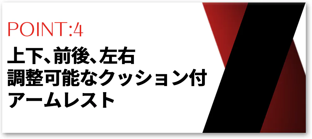 アームレストはボタンを押すだけで上下に調整が可能なため、ベストなポジションを確保していただけます。さらにクッションが付いており、腕や肘をサポートします。