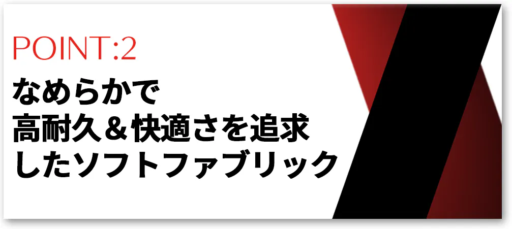 ソフトファブリック素材を使用した利点として、通気性の高さ・肌と接触する生地の柔らかさ・人工皮革で発生するような摩擦による異音を防ぎ、心地良い使用感と静寂な空間を作り出し集中力をUPしてくれます。耐引裂性・引張強度など、ISOでテストされた品質で耐久性と快適性の両立を実現しました。