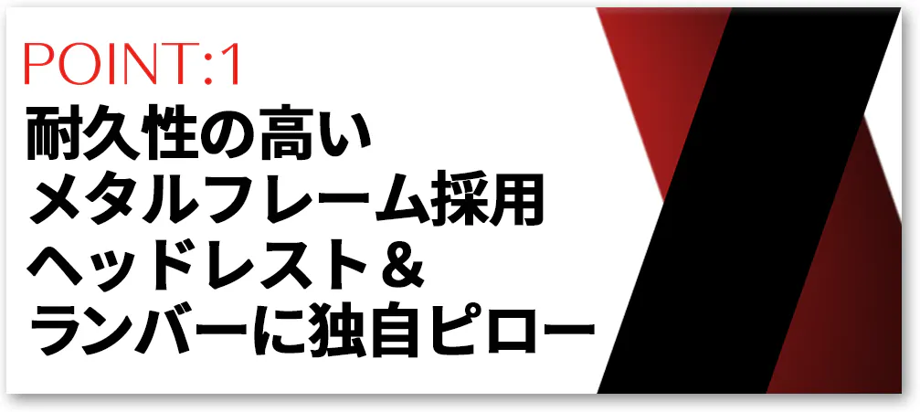 耐久性のあるメタルフレームを採用したことにより安定感も確保。腰を支えるためのランバーピローと首と頭を支えるためのArrozzi独自のヘッドレストピローを付属。最適なポジションを確保し、長時間快適な環境でのプレイを可能にします。