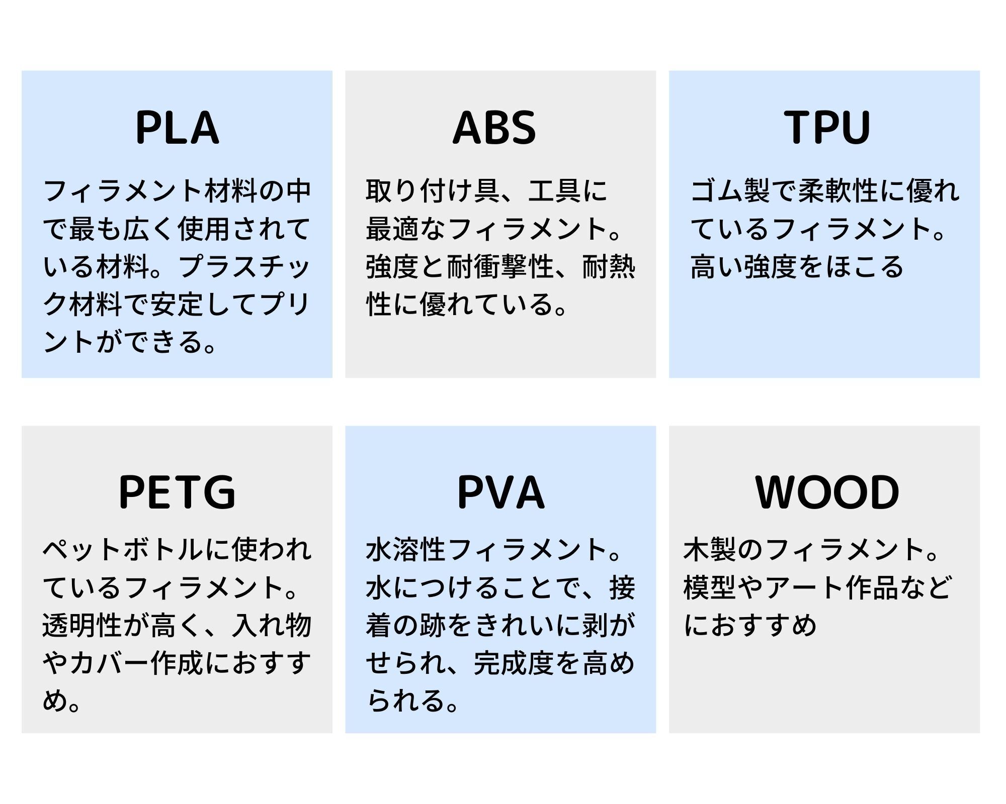 Artist-Dは多種多様なフィラメント(素材)を使用して印刷することが可能です。それぞれの素材には以下のような特徴があります。印刷する素材によって、製品にも風味や独特の個性を演出することができます。以下フィラメント以外にも多数のフィラメントが実用可能。