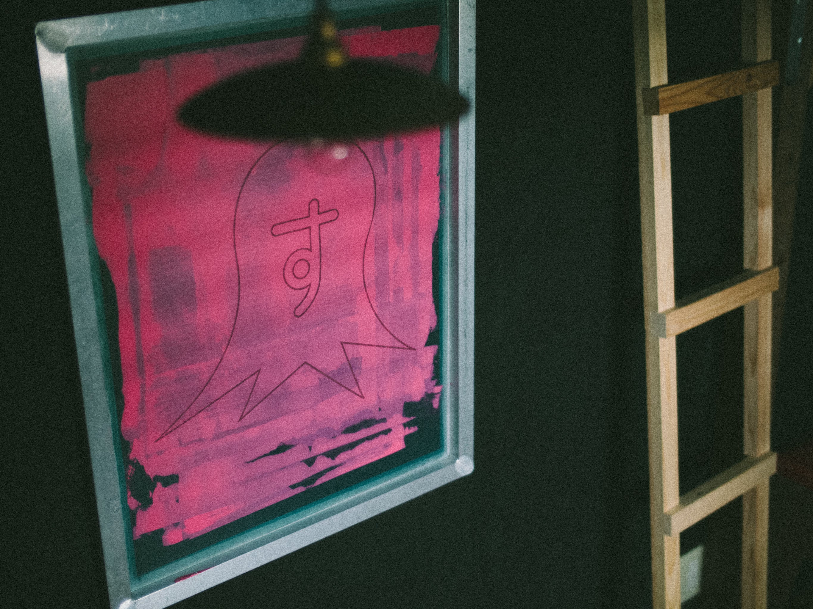 みなさんにお渡ししたTシャツにプリントしたシルクスクリーンの版を飾っています。