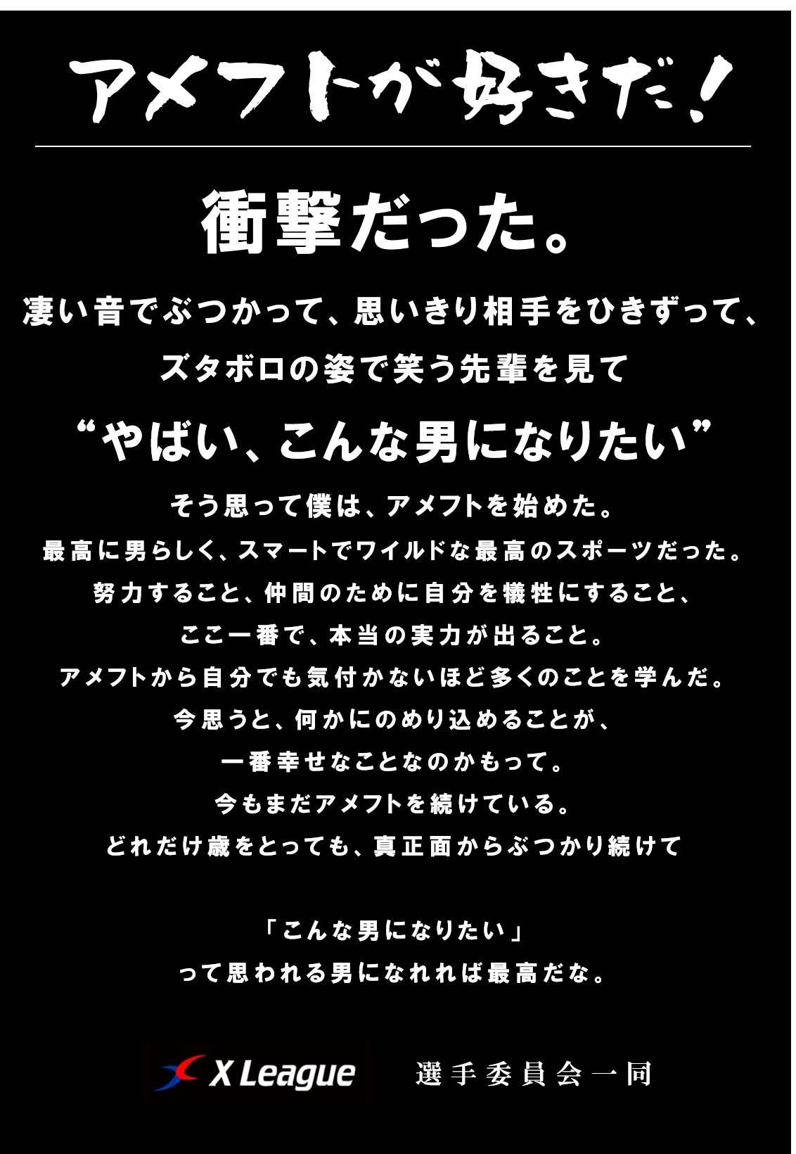 最後に、Xリーグの選手が所属する選手委員会が、アメリカンフットボールへの想いを込めて作成したメッセージを掲載しますので、アメリカンフットボールを始めた時のことを思い出して頂けたら幸いです。