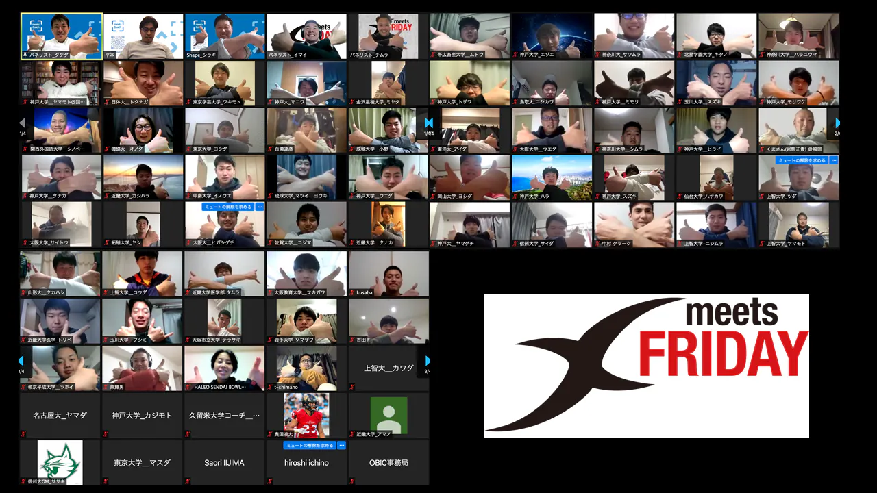 アメリカンフットボールファミリー(学生フットボーラー)に寄り添う活動の一環としてNPO法人「Shape the Dream」のmeetsCoachプロジェクトと連携し【X meets Friday】と題したオンラインイベントを19日に実施しました。