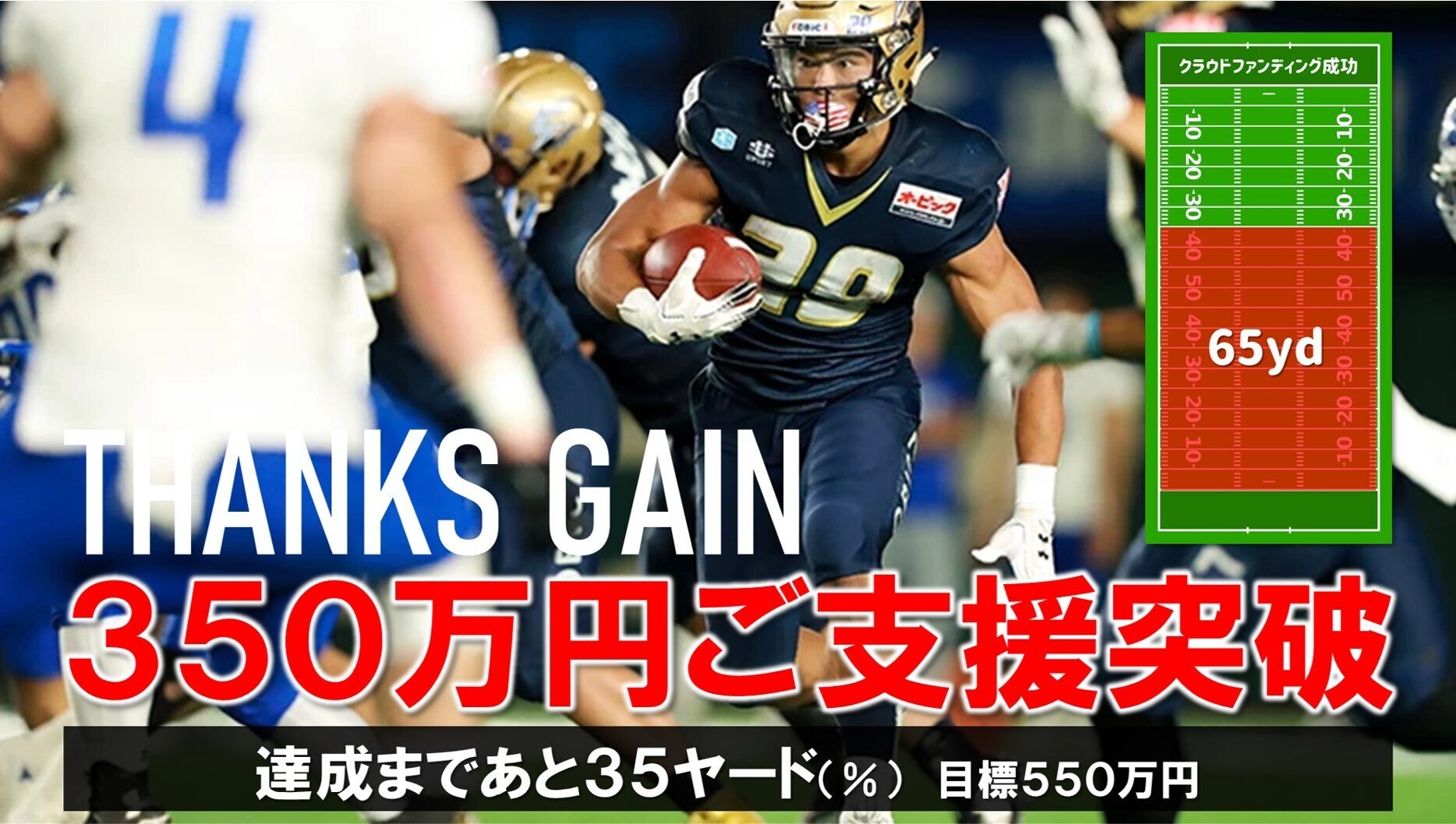 皆さま、温かいご支援や応援メッセージありがとうございます。また、本プロジェクトに興味を持っていただけたことに心から感謝申し上げます。本日、支援金350万円突破致しました!本当に温かい支援ありがとうございます。また沢山のSNSでの投稿シェアも頂き本当にありがとうございます。残り17日で、残り35ヤード。皆様と力を合わせてタッチダウンがとれますように真摯に取り組みます。引き続き温かいご支援どうぞよろしくお願い致します。【Xリーグからのお知らせ・お願い】★Youはなぜアメフトを??皆様のオリジナルストーリー募集中!!Xリーグでは、新たな新歓活動を支える活動の一環として、アメリカンフットボールファミリーの皆さまがお持ちの「Youはなぜアメフトを?あなただけのアメフトストーリー」の募集もしています。皆さんが一人一人が持つアメフトストーリーがありましたらご登録頂ければ幸いです。●URL: アメフトストーリーの登録はこちらhttps://forms.gle/QpwG8LS2MTjETVek7★「#アメフトやろうぜ」でモメンタムを!!!現在、支援者・賛同者の皆さんが中心となり、フットボールファミリーの皆様がお持ちの「オリジナルストーリー」に「本プロジェクトURL」と「#アメフトやろうぜ」を加えてSNSに投稿する流れが生まれております。是非、皆様からも本プロジェクトとアメフトの魅力を広めて頂ければ幸いです。●投稿テーマ①アメリカンフットボールを始めたきっかけ②アメリカンフットボールの魅力③アメリカンフットボールで一番の想い出④その他(新歓活動の思い出 等)URL: https://camp-fire.jp/projects/view/351509沢山の方に「#アメフトやろうぜ」の思いから大きなモメンタムが生まれますように。最後に、Xリーグの選手が所属する選手委員会が、アメリカンフットボールへの想いを込めて作成したメッセージを掲載します。アメリカンフットボールを始めた時のことを思い出して頂けたら幸いです。今よりも少しでも良くなる未来をアメリカンフットボールに関わるすべて皆様で力を合わせて一緒に創ることができればと心より願っています。●アメフトが好きだ(Xリーグ選手委員会メッセージ):
